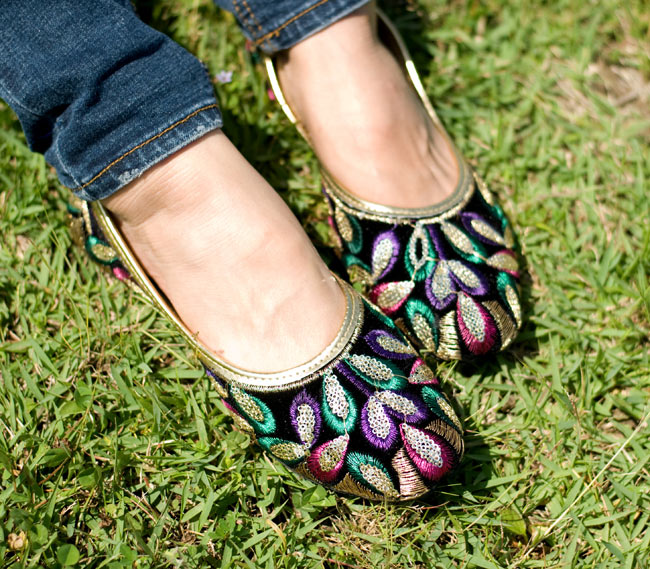 まさにインド!という華やかなフラットシューズがやって来ました。ビーズやスパンコールがキラキラと輝き、ところ狭しと刺繍が施されています。このシューズでパンジャビドレスやサリーを合わせたら、コーディネートは完璧だね!というインドスタイルです。どちらも微妙にデザインが異なりますが、どれが良いか迷ってしまうくらいバランスの取れた配色にうっとりします。インドの女性って本当に華やかなデザインが好きなんだな〜と改めて実感する一品です。エスニックファッションだけでなく、シンプルにデニムやTシャツに合わせてもかっこよく決まりますよ!■現地のインド人女性向けの商品です