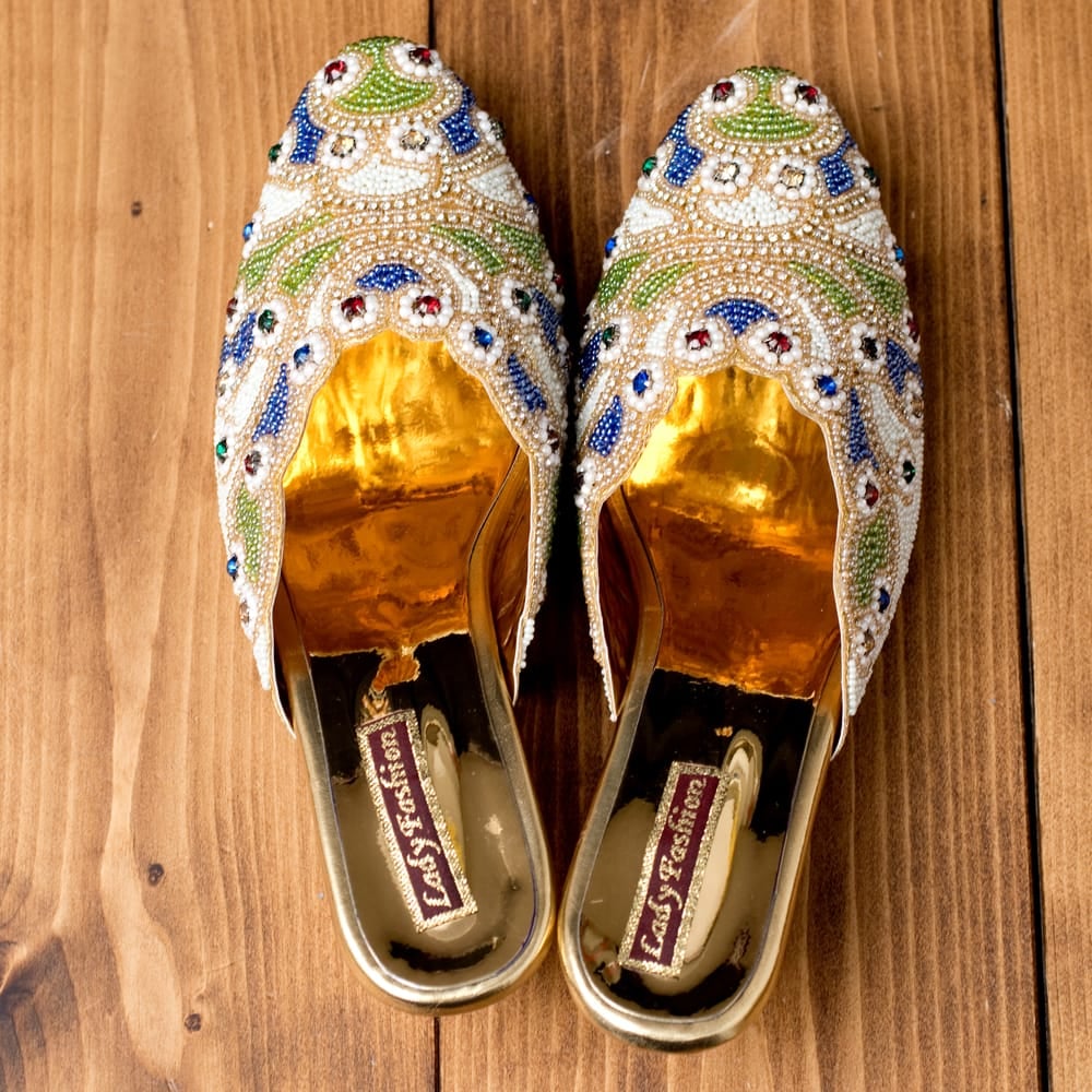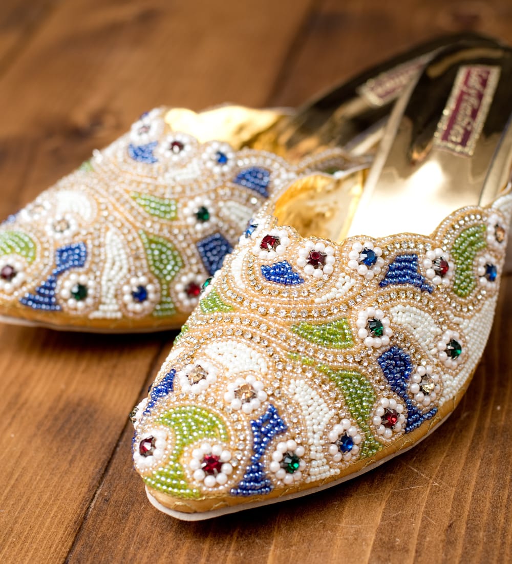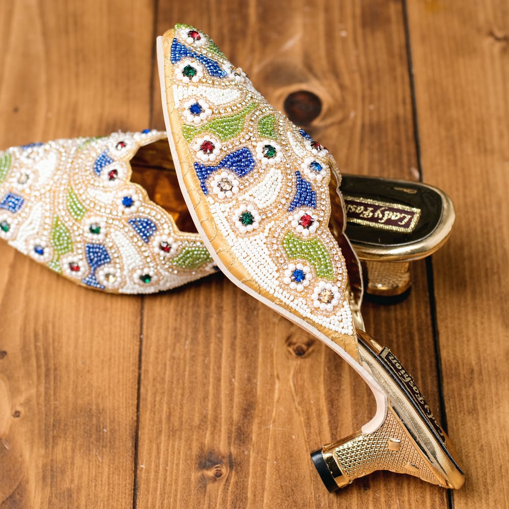 まさにインド!という華やかなミュールがやって来ました。ヒールなので美脚、脚長効果もあり横から見た時のシルエットも綺麗です。靴にはところ狭しと華やかなラインストーン施され、キラキラと輝き足元が華やかになります。インドの女性って本当に華やかなデザインが好きなんだな?と改めて実感する一品です。エスニックファッションだけでなく、シンプルにデニムやTシャツに合わせてもかっこよく決まりますよ!