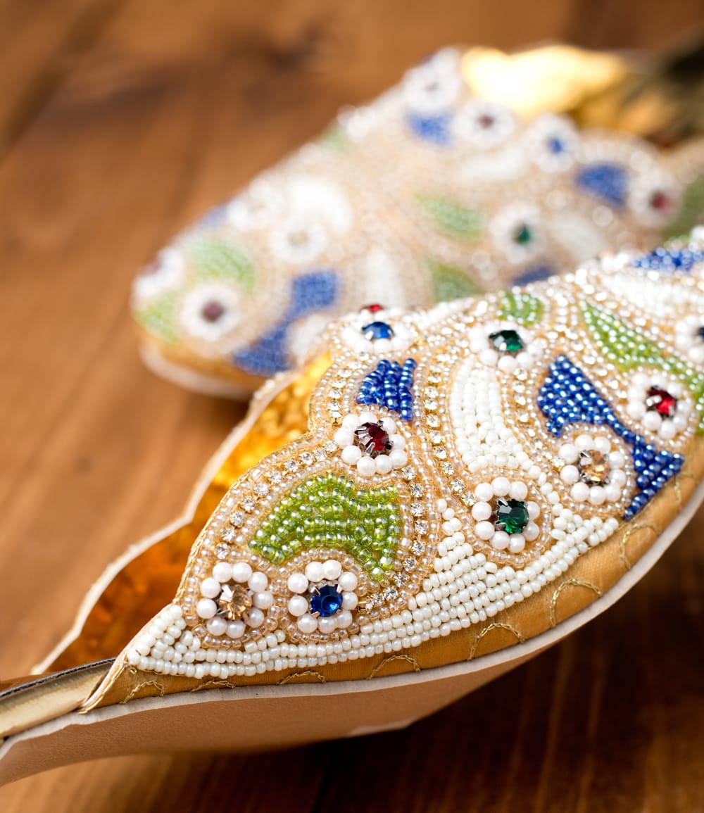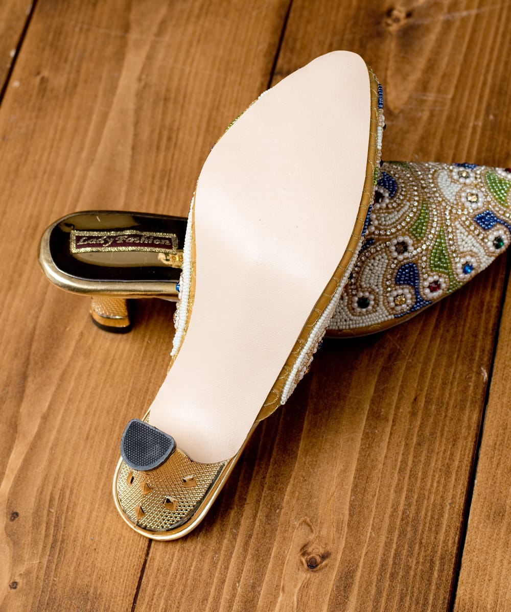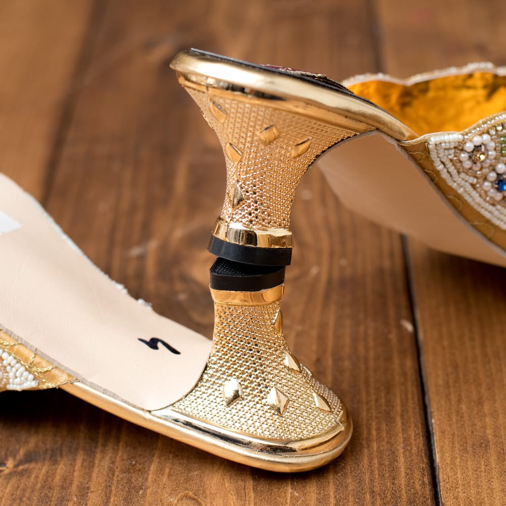 まさにインド!という華やかなミュールがやって来ました。ヒールなので美脚、脚長効果もあり横から見た時のシルエットも綺麗です。靴にはところ狭しと華やかなラインストーン施され、キラキラと輝き足元が華やかになります。インドの女性って本当に華やかなデザインが好きなんだな?と改めて実感する一品です。エスニックファッションだけでなく、シンプルにデニムやTシャツに合わせてもかっこよく決まりますよ!