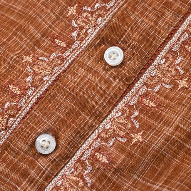 クルタは襟元と前たての刺繍が美しい。しっかりした機械刺繍なので洗濯にも耐えます。襟をとめるボタンはありません。楽ですが、自分はきちっと着たいので見えない部分にスナップをつけて閉じるようにしました。襟にはやや硬めの芯地がはいっています。きちんと感がありつつ、くつろぐのにも気にならない程度かと思います。