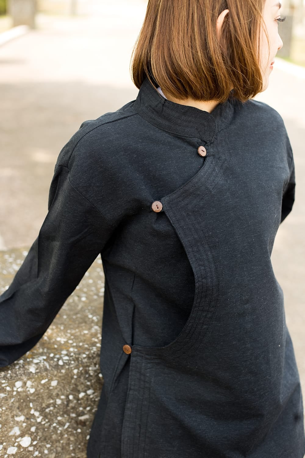 三つのボタンはすべて外せますが、裾が縫い合わせてあるので、前開きにはなりません。