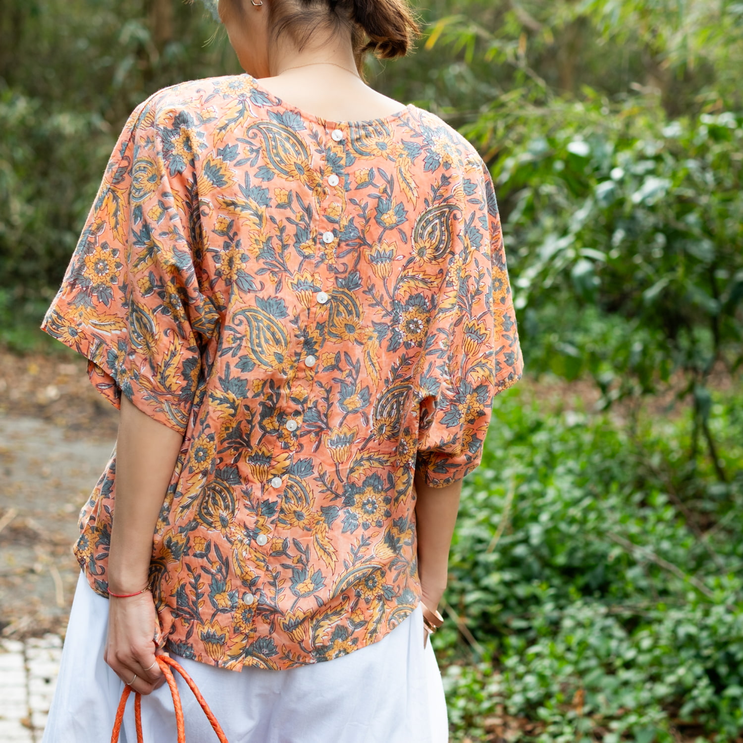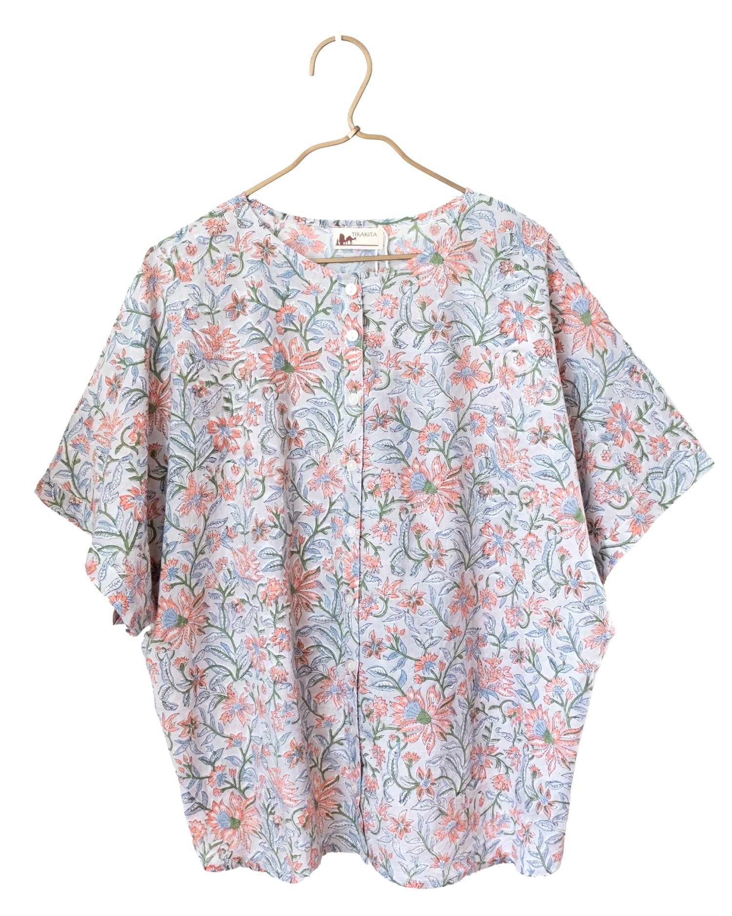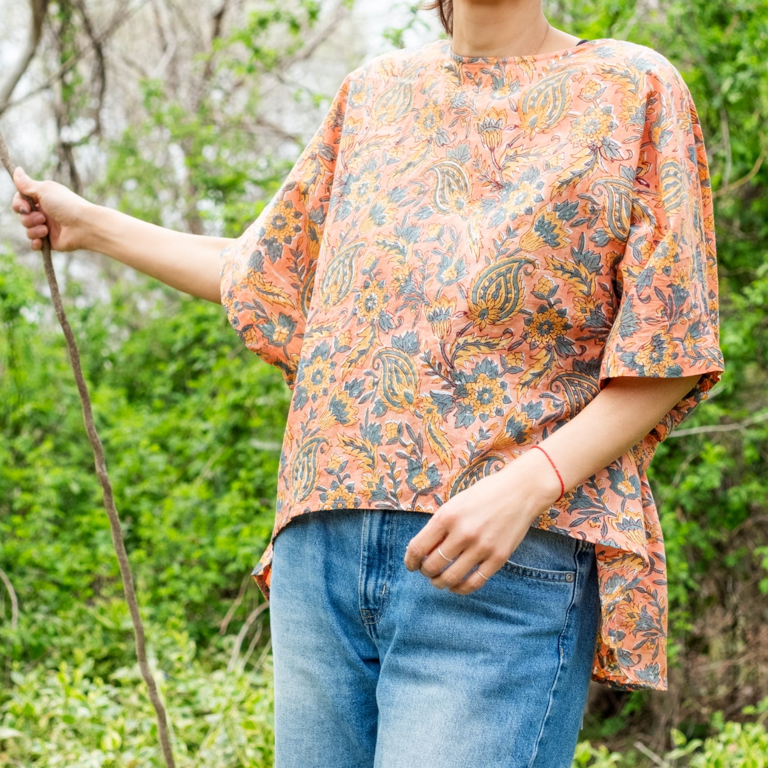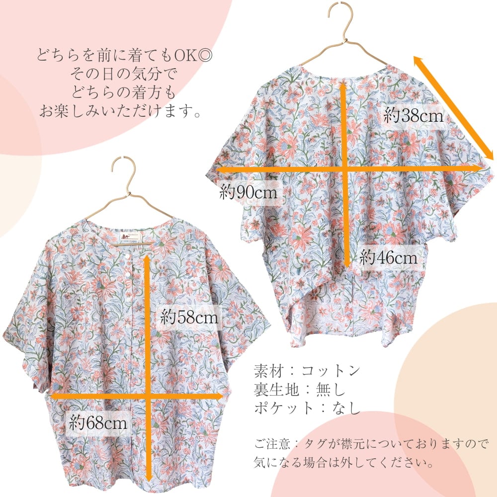 インドの伝統技法ブロックプリントで仕上げた、ナチュラルなインド綿シャツです。 北インドのジャイプールで作られた木版デザインの布を、おしゃれに日常使いできるようにしたシャツが出来上がりました。ナチュラルな色合いの花柄と、さらりとした軽やかなインド綿の着心地が魅力です。 前後どちらにしてもしっくりくるデザインなので、その日の気分でどちらを前にするか決めてお楽しみください!■嬉しい体型カバー