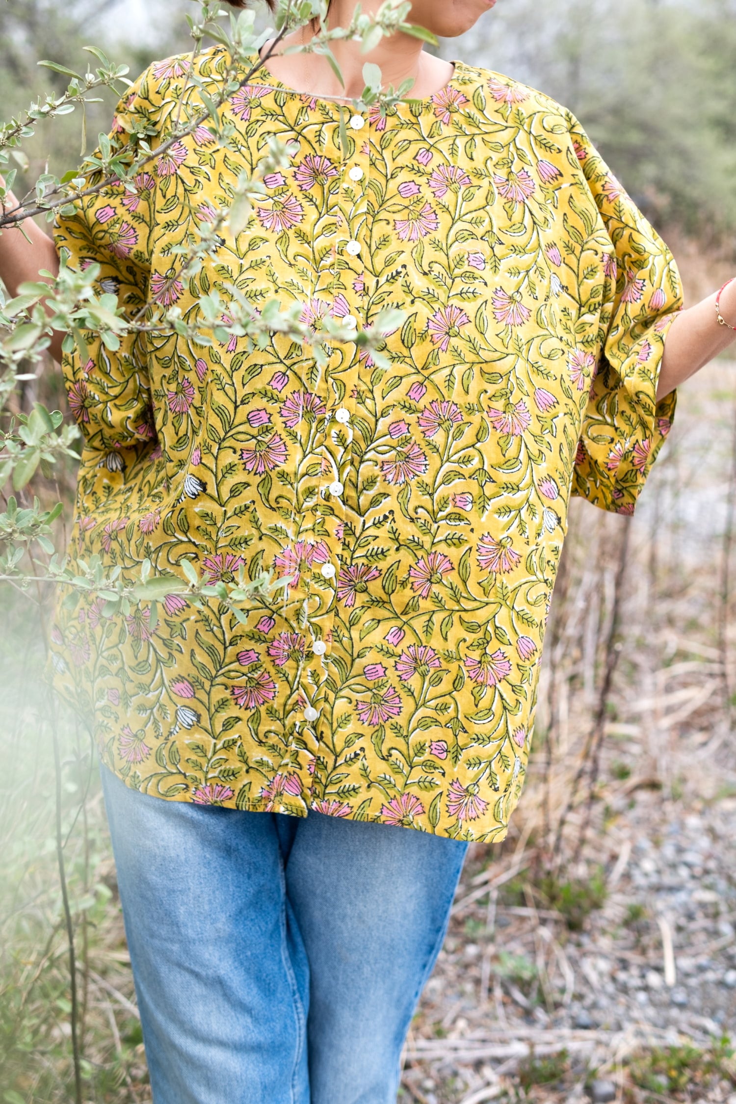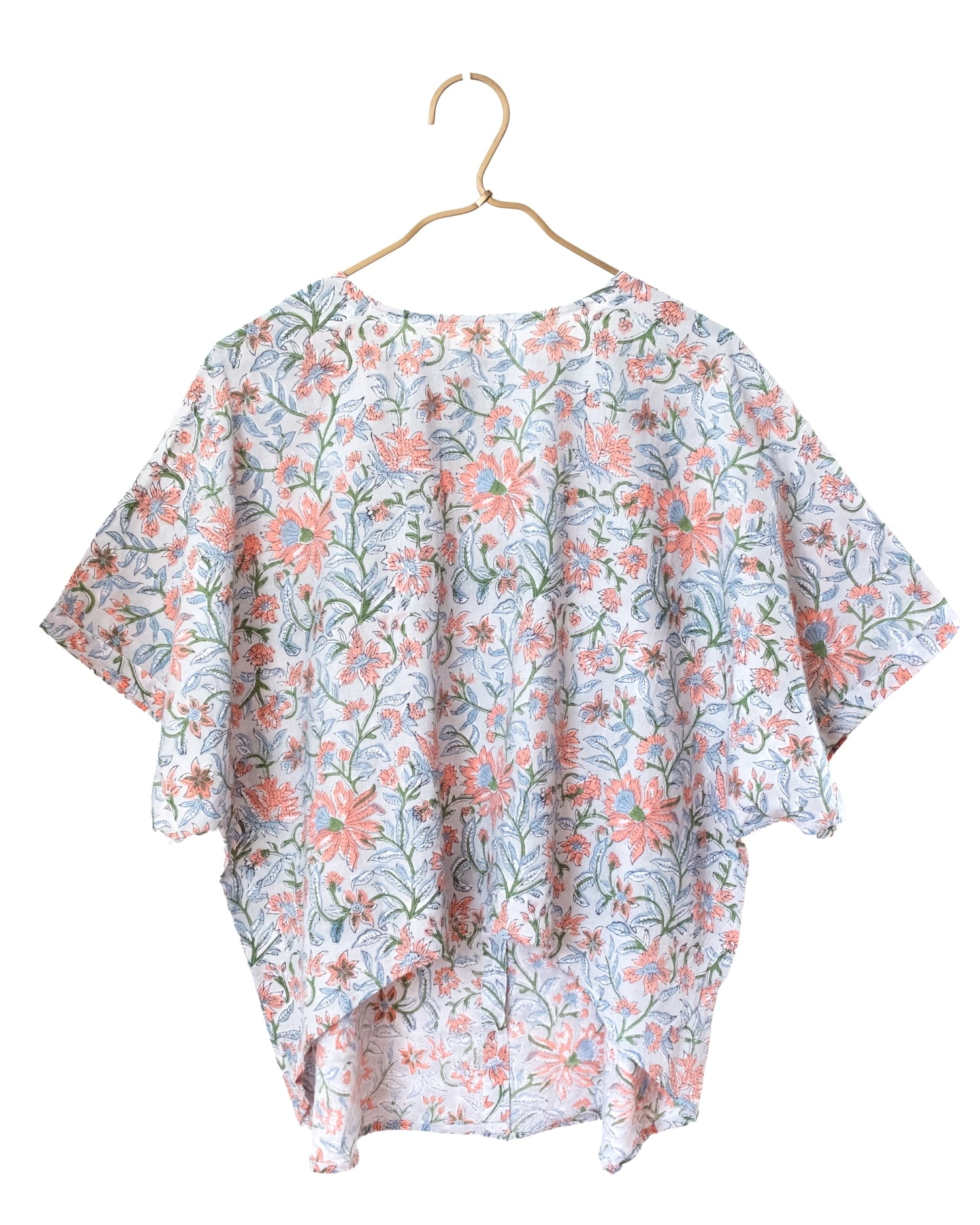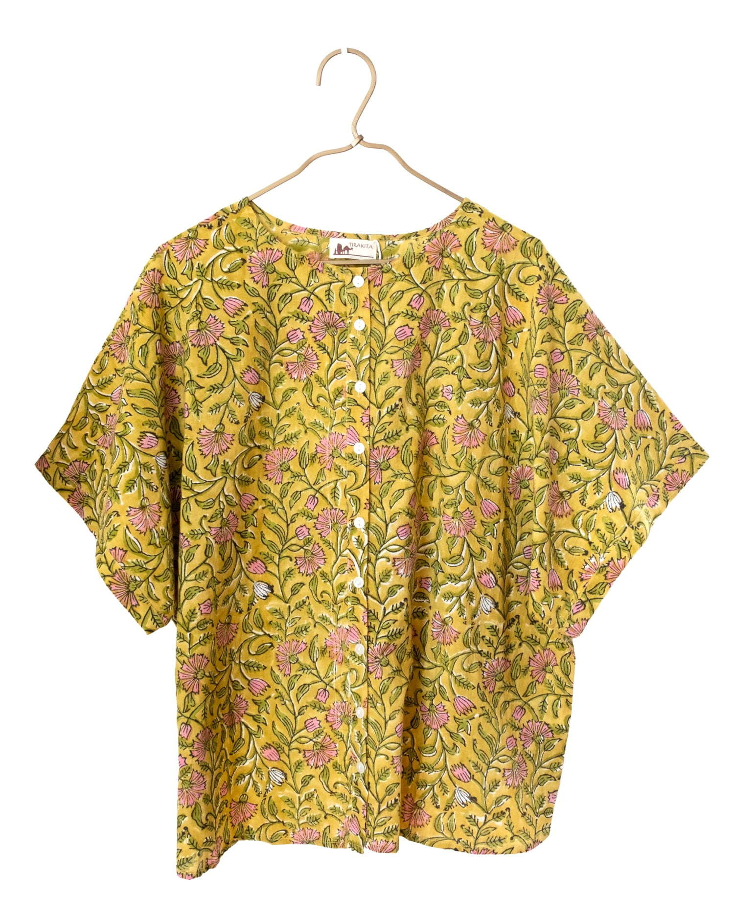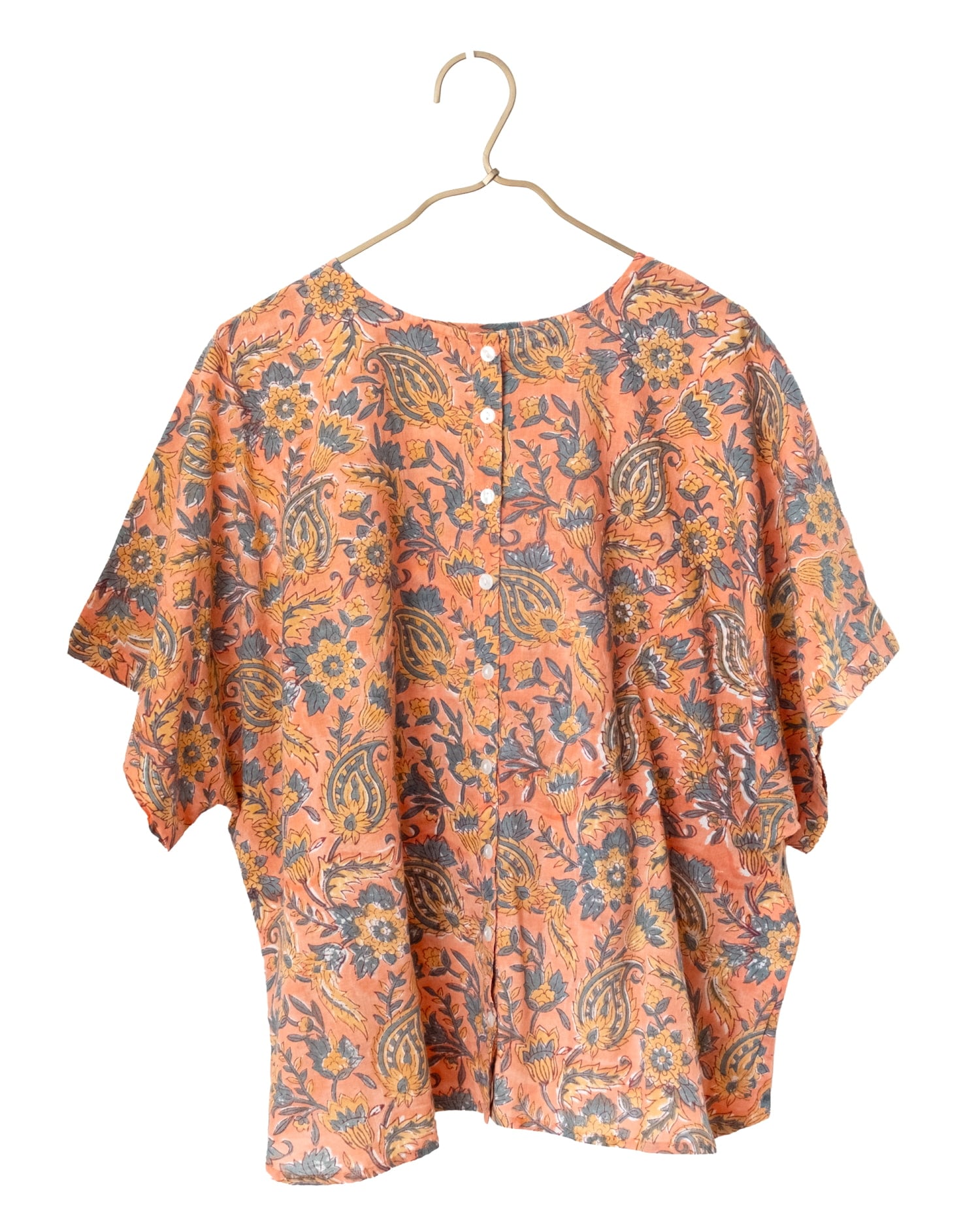 インドの伝統技法ブロックプリントで仕上げた、ナチュラルなインド綿シャツです。 北インドのジャイプールで作られた木版デザインの布を、おしゃれに日常使いできるようにしたシャツが出来上がりました。ナチュラルな色合いの花柄と、さらりとした軽やかなインド綿の着心地が魅力です。 前後どちらにしてもしっくりくるデザインなので、その日の気分でどちらを前にするか決めてお楽しみください!■嬉しい体型カバー