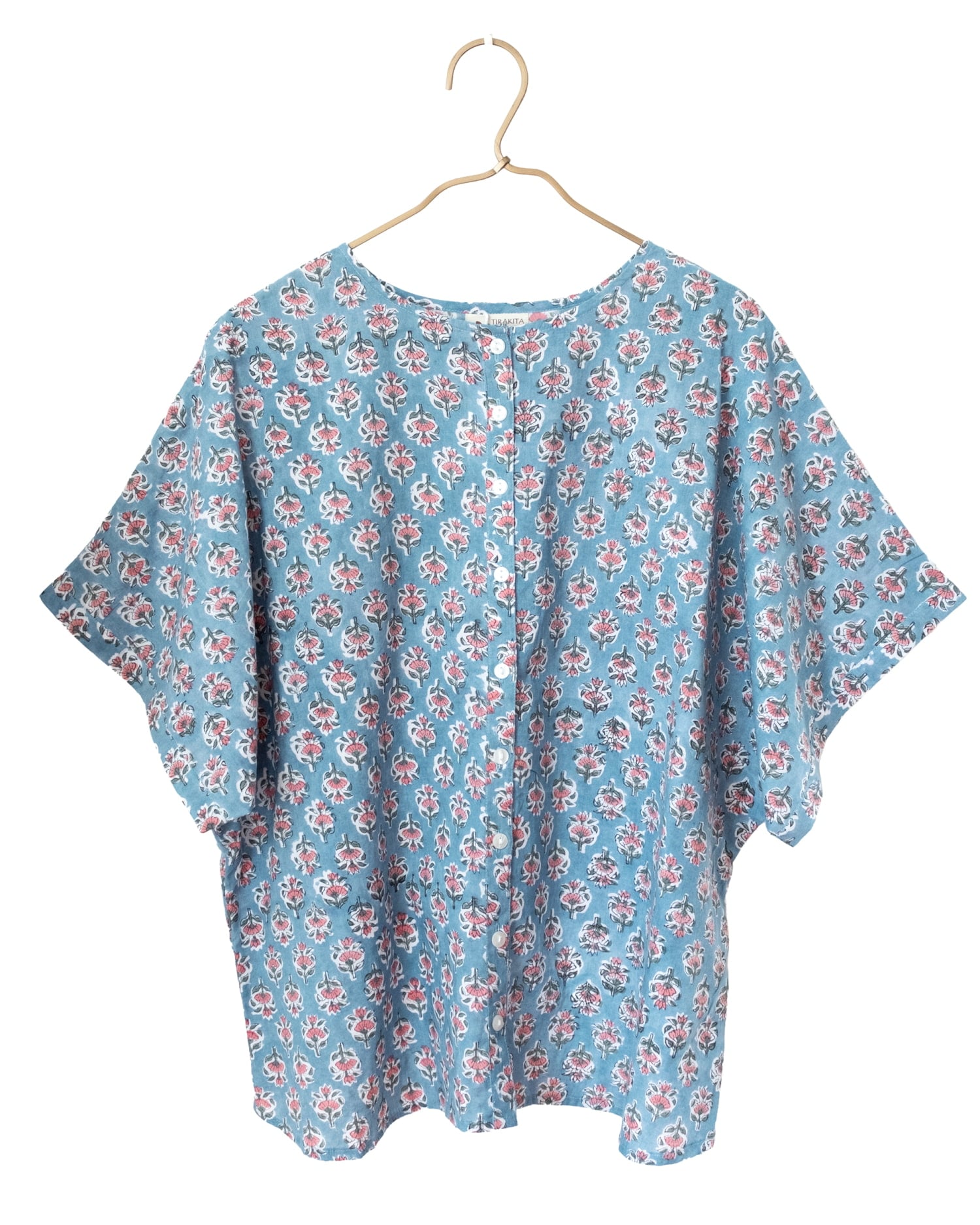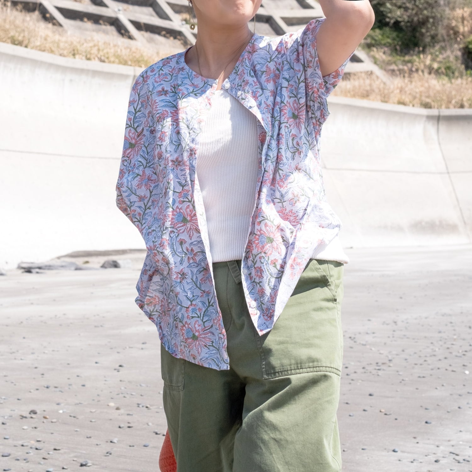 インドのラジャスタン州ジャイプルで古くから継承されて木版染め。デザインを考え、木を彫り、スタンプのように布に押していく。その工程は全て手作業で行われており、色が変わるたびに版を交換するため非常に時間のかかる丁寧な手仕事の賜物といえます。そんな布をふんだんに使用したシャツは非常に贅沢な一品です。全てハンドメイドのため、独特のムラがあり工業製品にはない温かみを感じることができます。 インドは美しい布の宝庫ですが、その中でも特に素敵な一枚に仕上がっています。