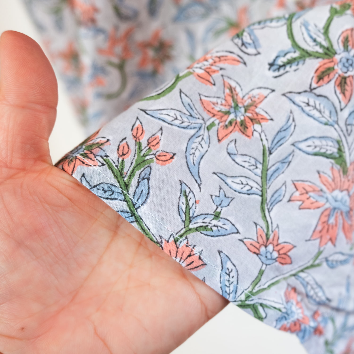 ナチュラルな色合いの花柄と、さらりとした軽やかなインド綿の着心地が魅力です。