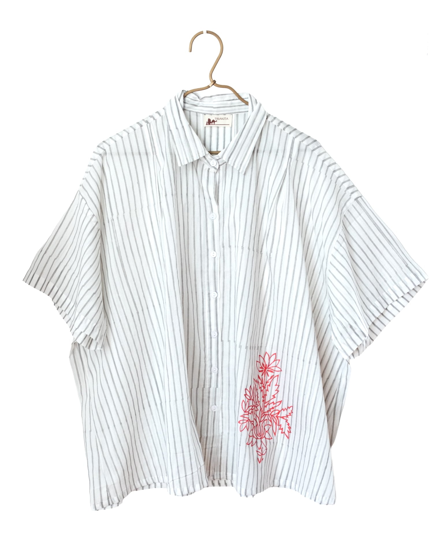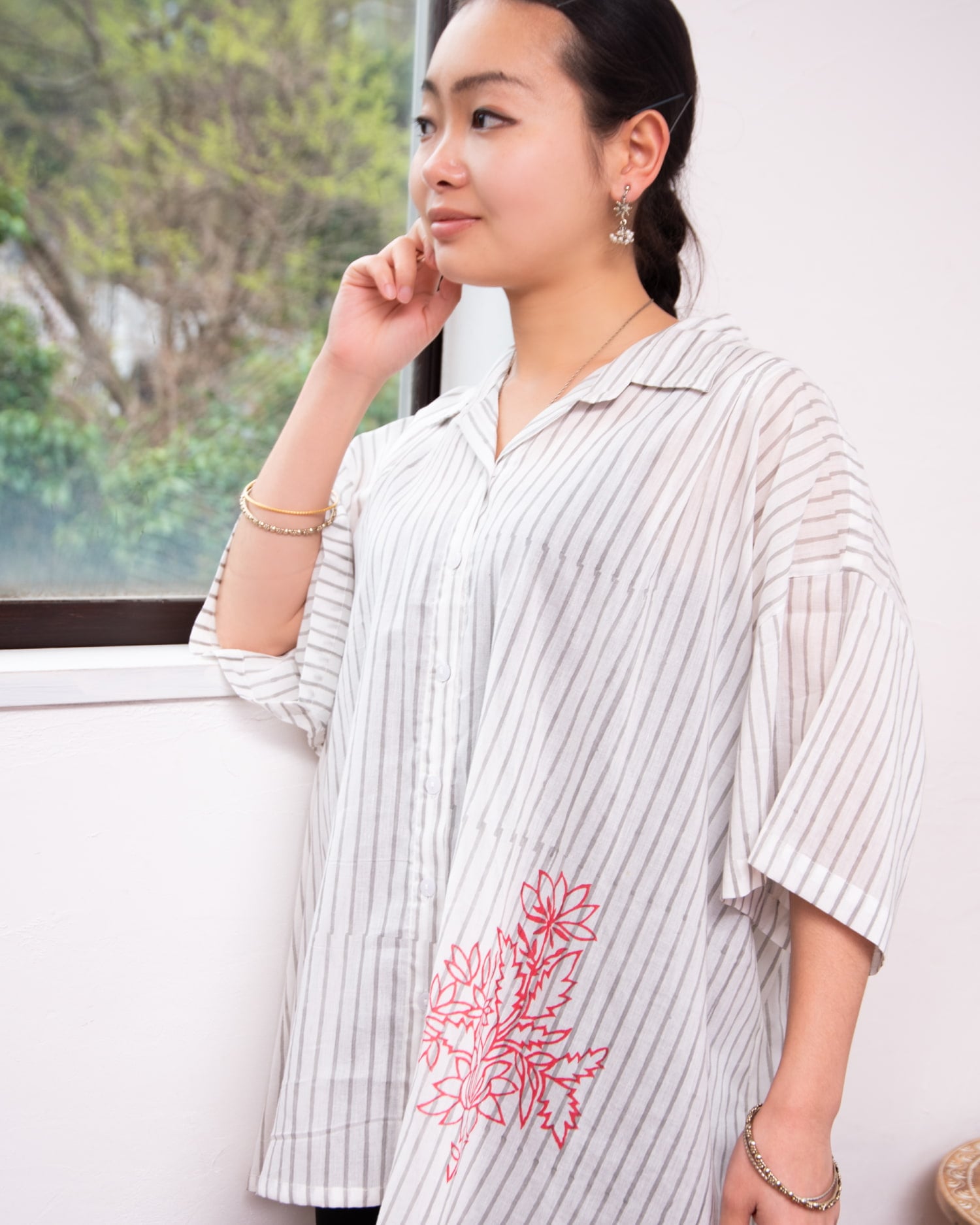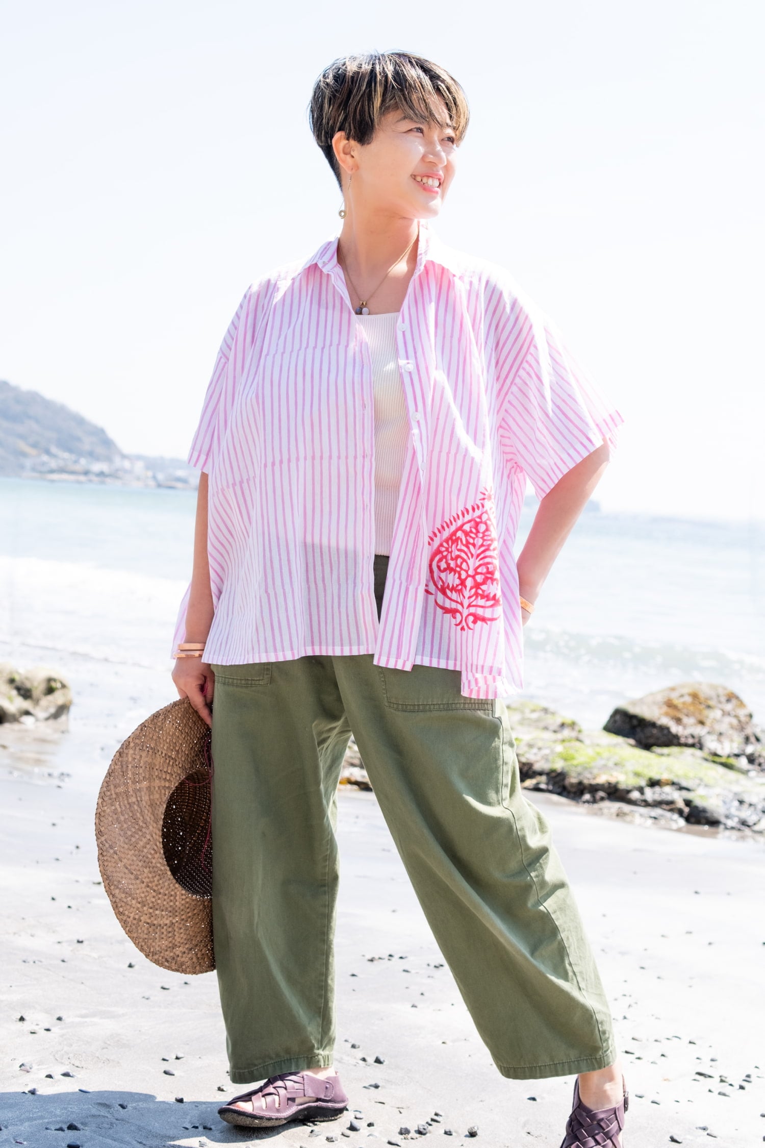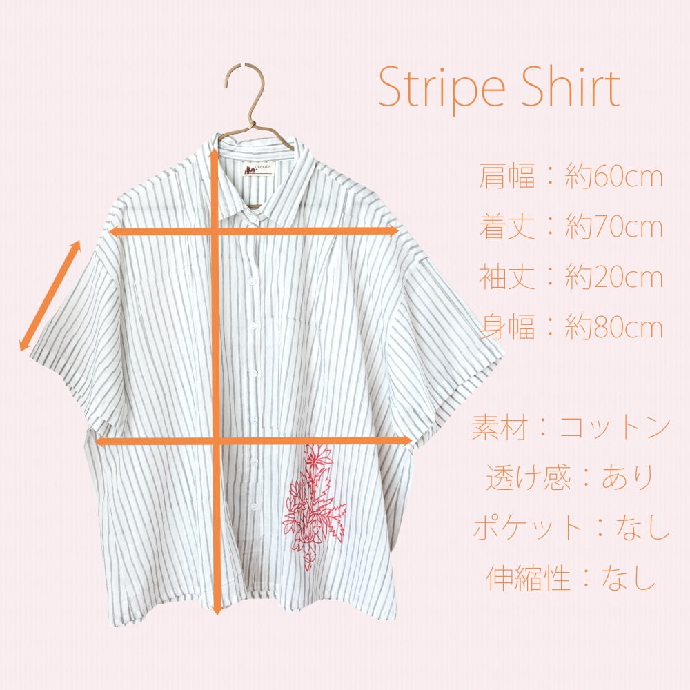 マニッシュな「ストライプシャツ」をベースに、裾にポンとあしらわれたウッドブロック(木版)プリントがエッジが効いていていいバランスです。前を留めて着るのはもちろん、キャミソールやタンクトップの上からサラリと羽織るのにもちょうどよいです。