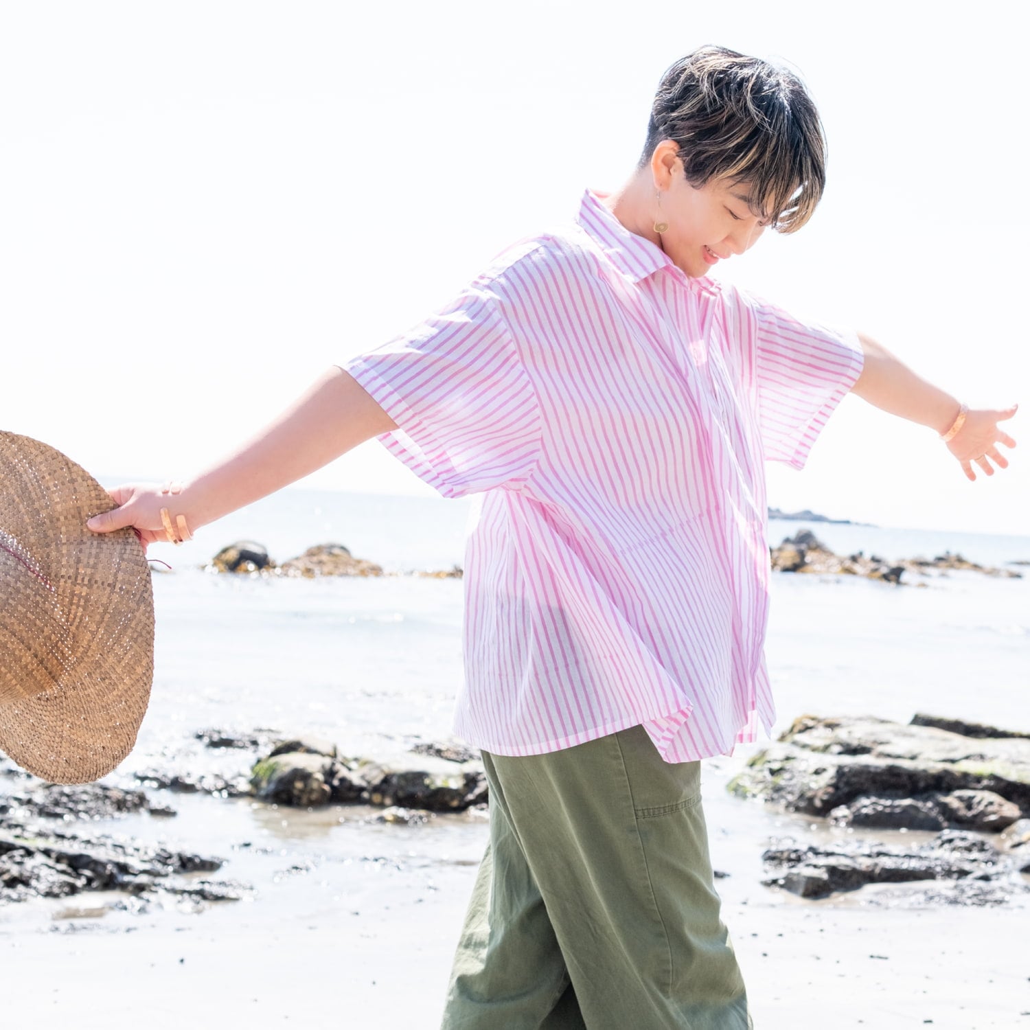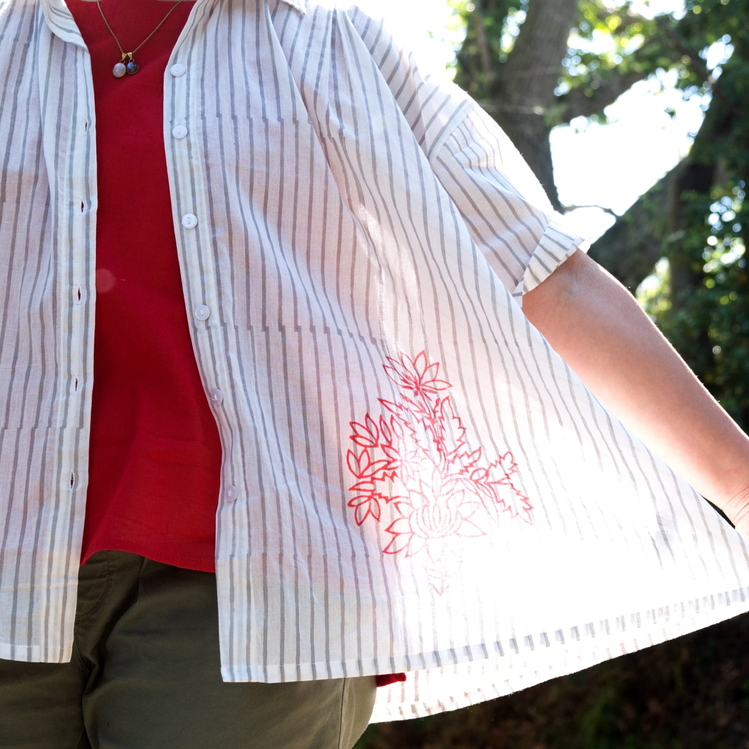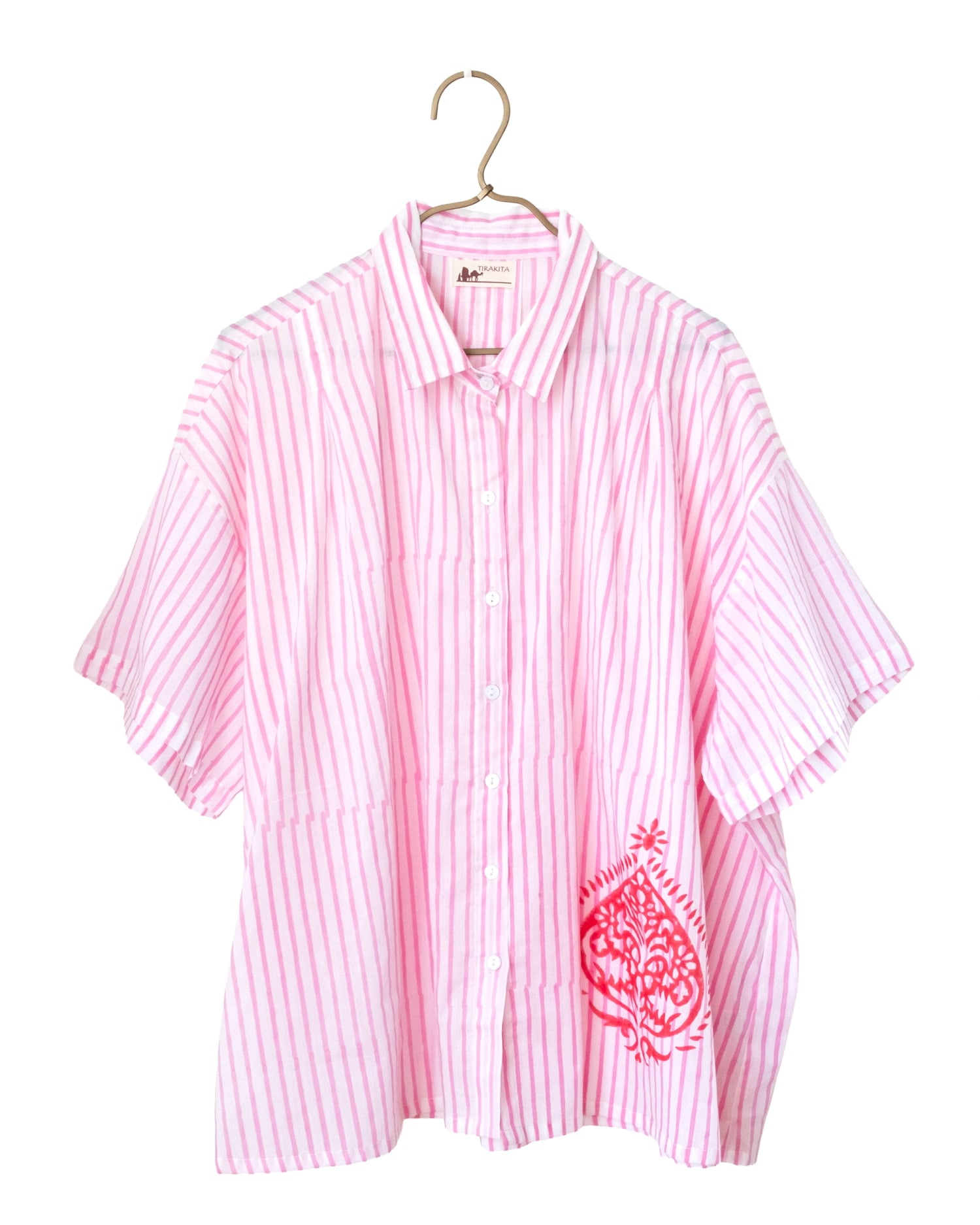 マニッシュな「ストライプシャツ」をベースに、裾にポンとあしらわれたウッドブロック(木版)プリントがエッジが効いていていいバランスです。前を留めて着るのはもちろん、キャミソールやタンクトップの上からサラリと羽織るのにもちょうどよいです。
