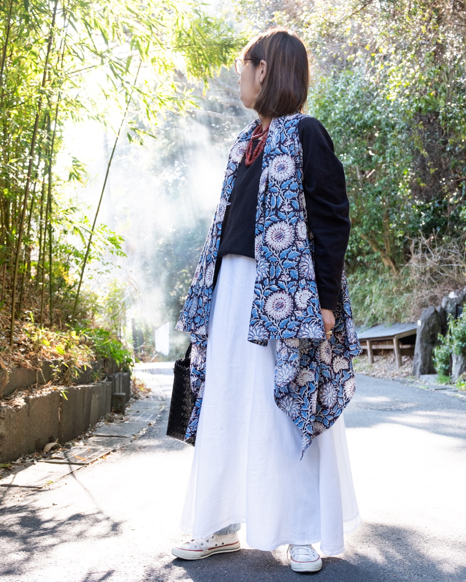 この一枚を羽織るだけで、一気に奥行きのある大人のエスニックスタイルが完成します。