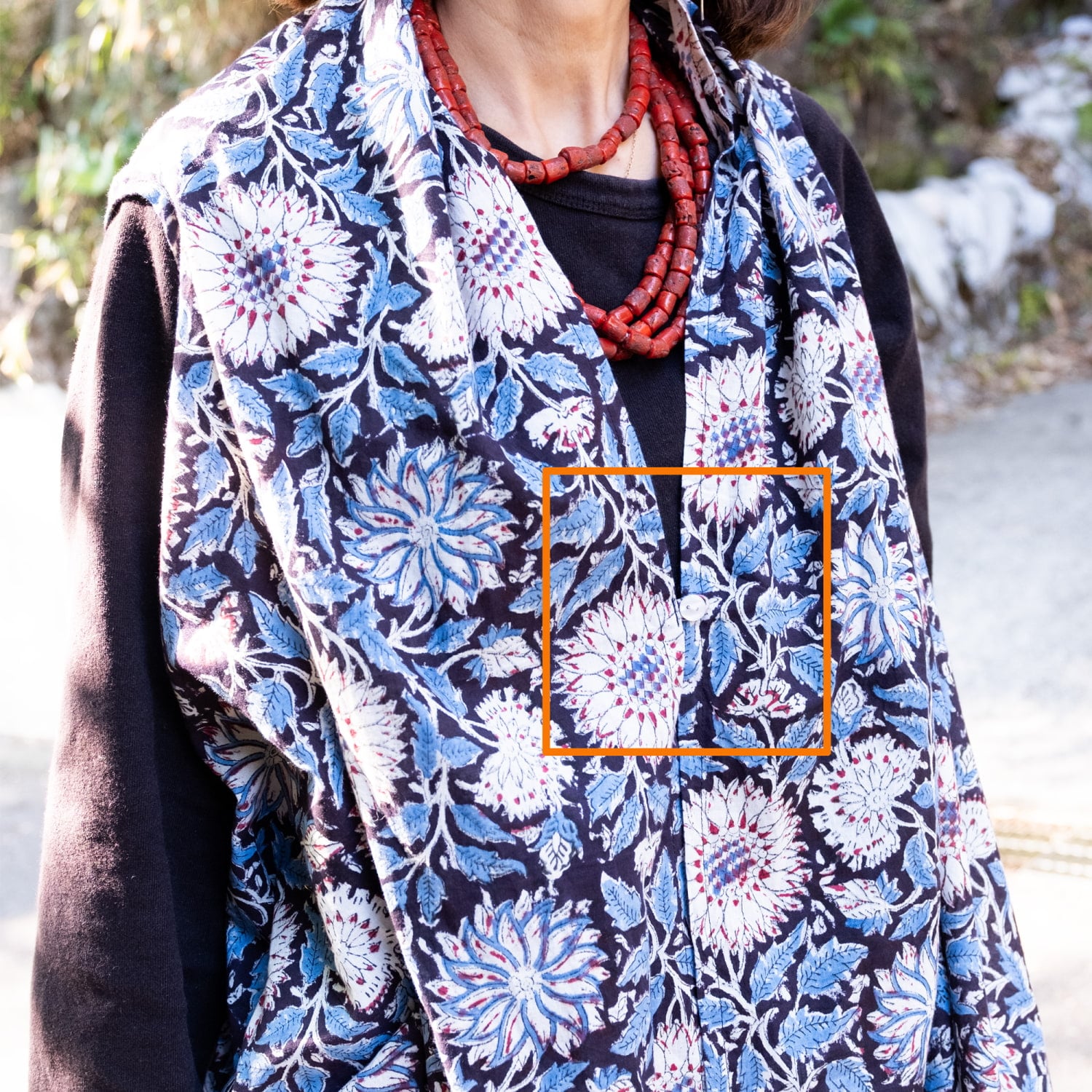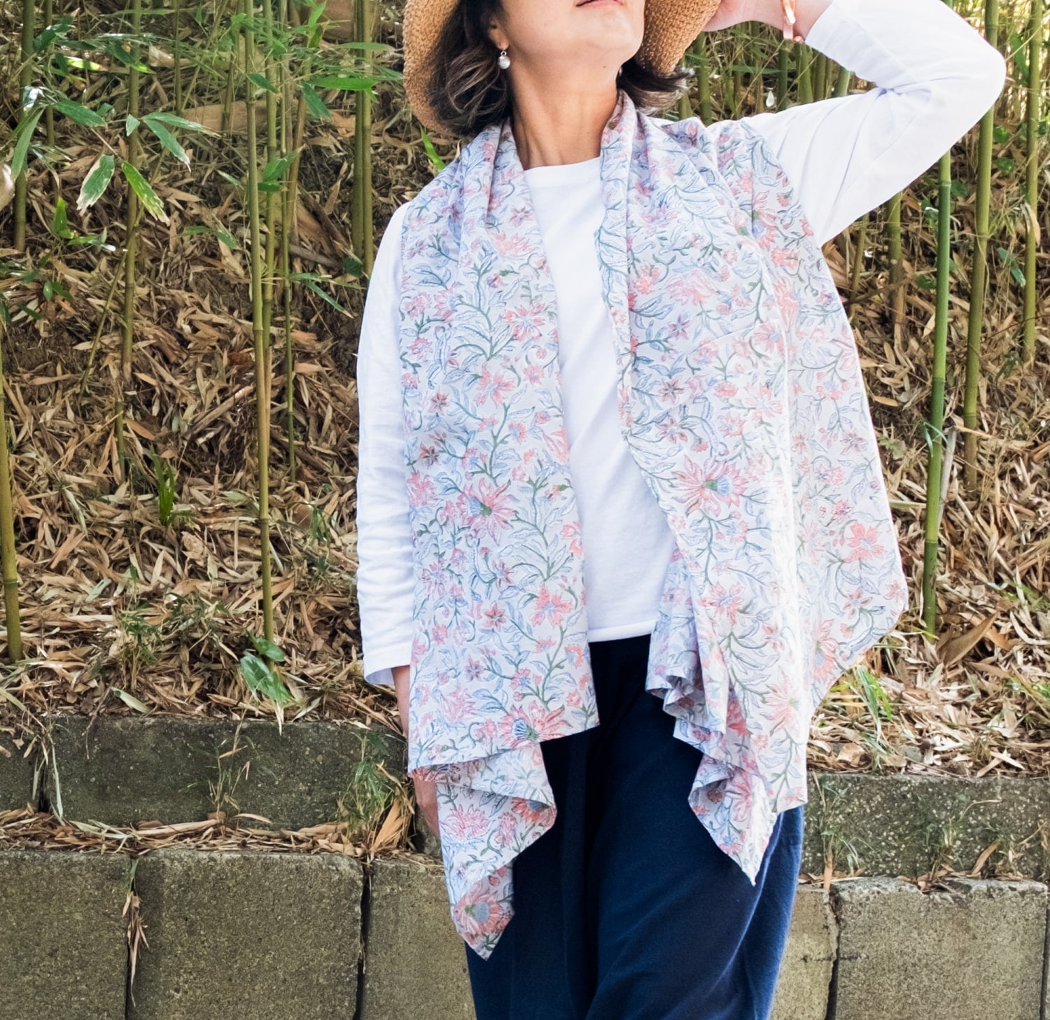 また、ストールとしても大活躍! ジレとしてだけでなく、首元に無造作に巻きつければ、ボリュームたっぷりのストールに早変わり。ウッドブロックの華やかな柄が顔まわりを明るく彩ります。旅先や冷房対策など、バッグに忍ばせておけば何通りもの使い方ができる心強い相棒です。