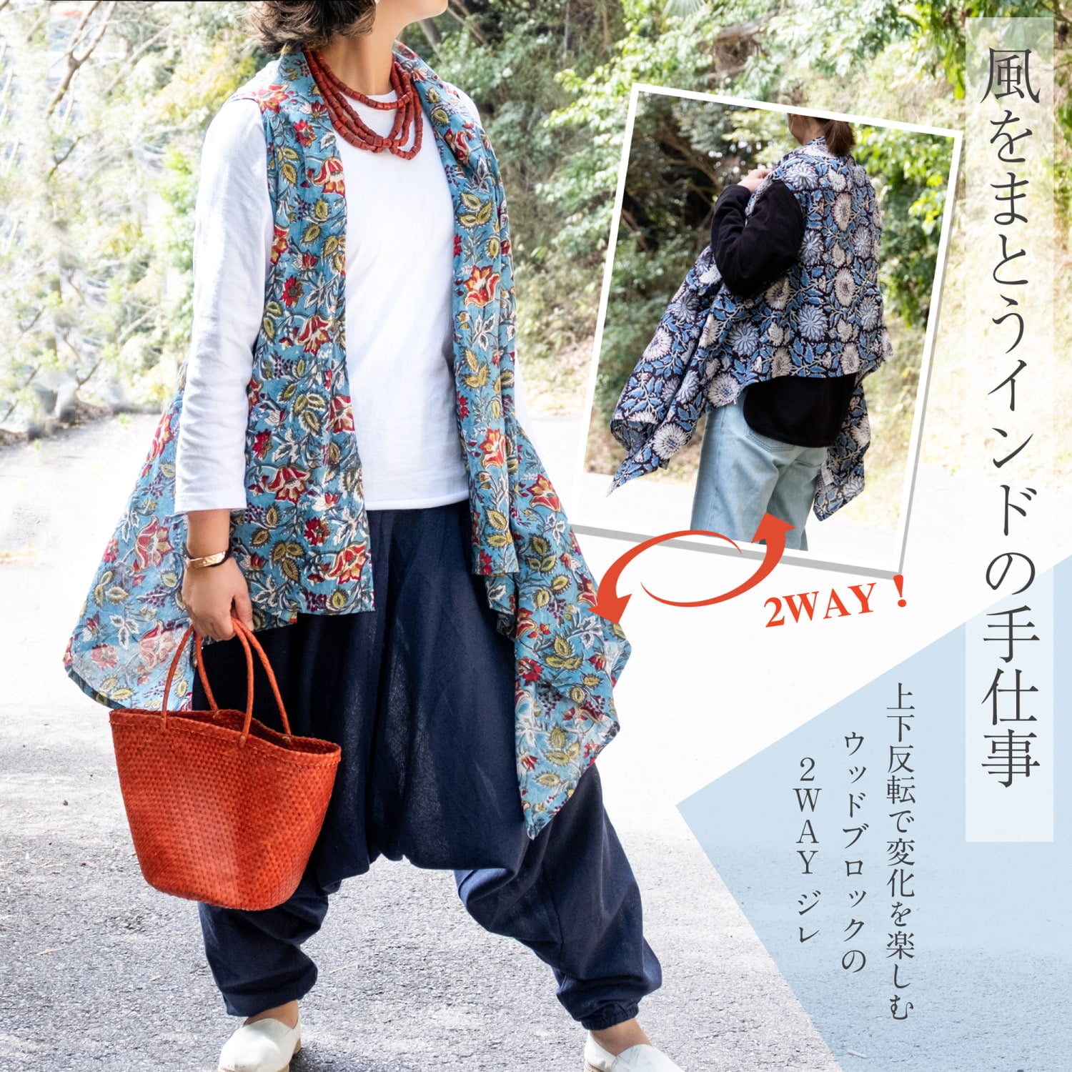 風をまとうインドの手仕事 上下反転で着回し無限大!2WAYウッドブロック・ジレ