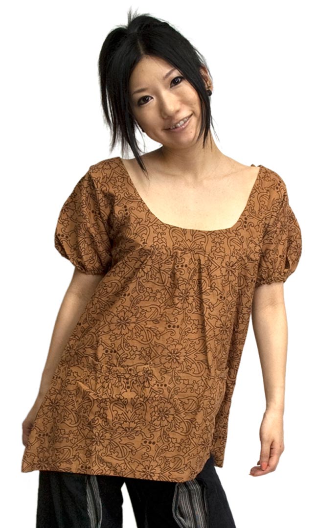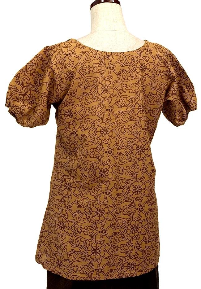 抽象的な花柄模様が一様にプリントされたチュニック。きゅっと締まったパフスリーブのそでと脇から裾にかけてなだらかなライン、大きく開いた胸元、二つのがま口型ポケットがとてもキュートで女性らしさを印象付けるデザインの一枚です。