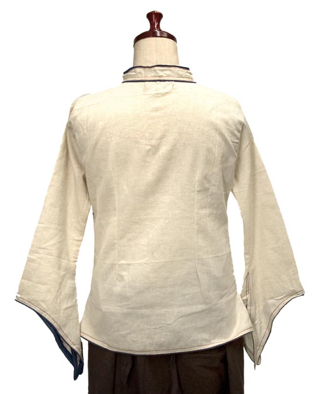 大きくカットされた、襟元のデザイン。こちらは、ステッチが赤色で切り返しの布色が紺のものです。