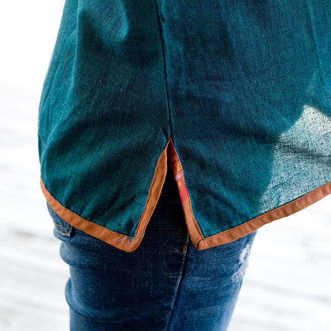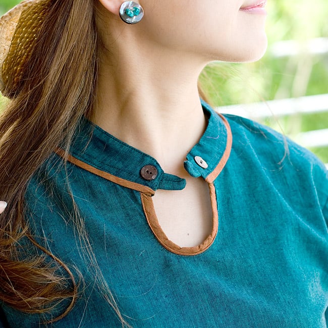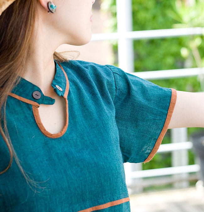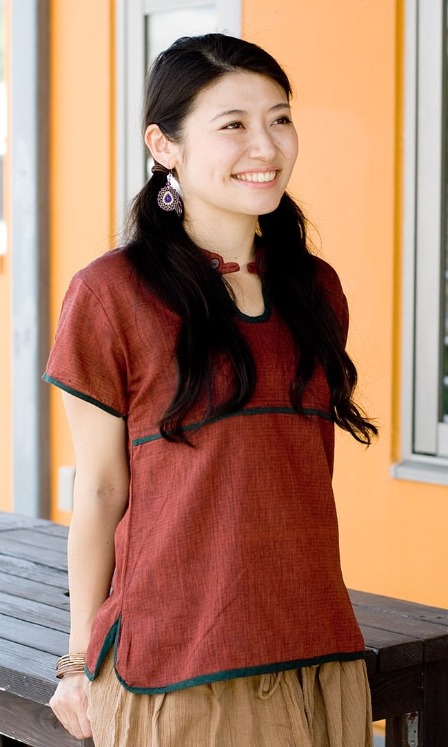 肌触りが心地よいコットンの半袖シャツがインドからやって来ました。襟元や袖口にほどこされたパイピングと生地の色のコントラストも個性的で素敵。カジュアルに着やすい一品です。■涼しくて暑い季節に最適!