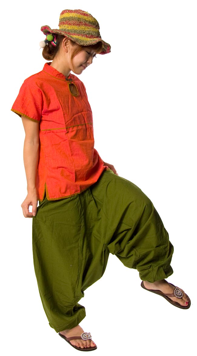 デニムなどでも合いますが、私は柔らかな生地のサルエルを合わせるのが好きです。