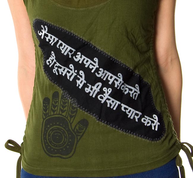このタンクトップはそのメヘンディをデザインとしてあしらった一枚。ヒンドゥー語も入っているタンクトップです。ヒンドゥー語の意味ですが、『how much you love your self, For other also you love same much』という意味のようです。
