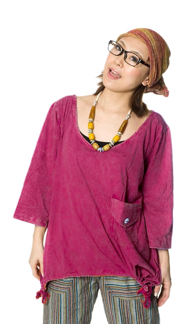 サイドの裾が長いトライアングルな形のゆったりTシャツです。襟の空きも大きくゆったりとしたデザインなので、バサッとゆったり着ていただくのにぴったりなデザインです。体型カバーもできて安心ですね。■サイドの紐を縛って着ても良し!