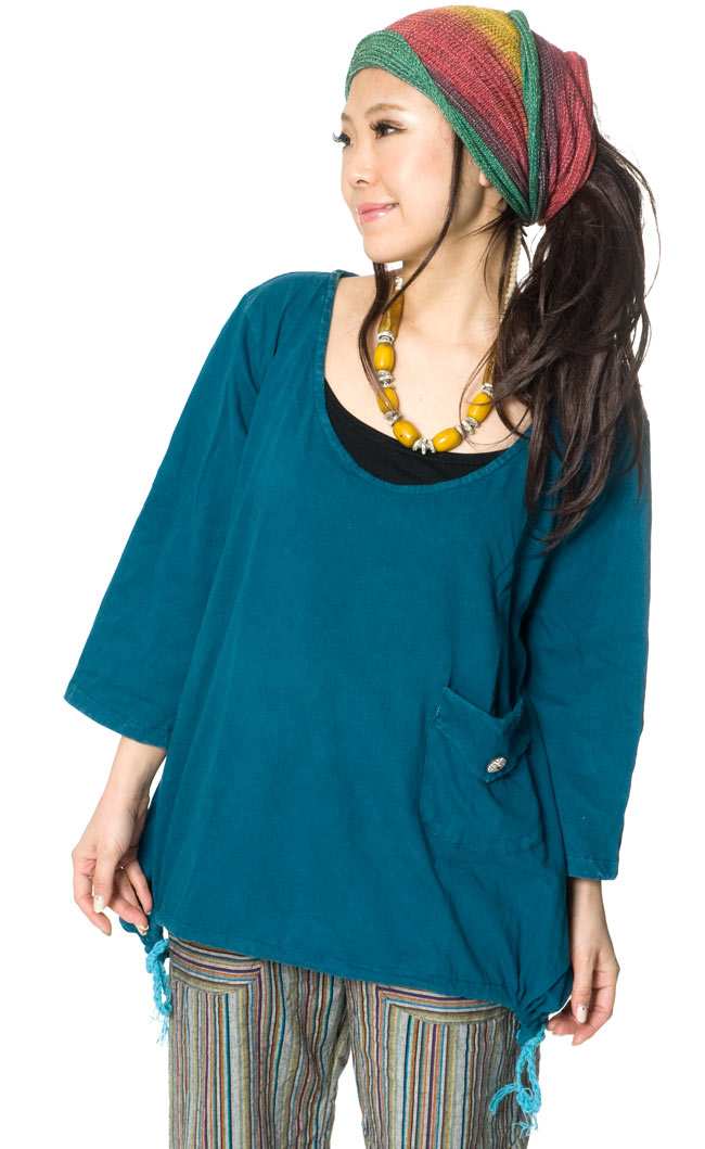 サイドのワンポケットがアクセントになっています。手作りの水牛のボタンで優しい風合いです。