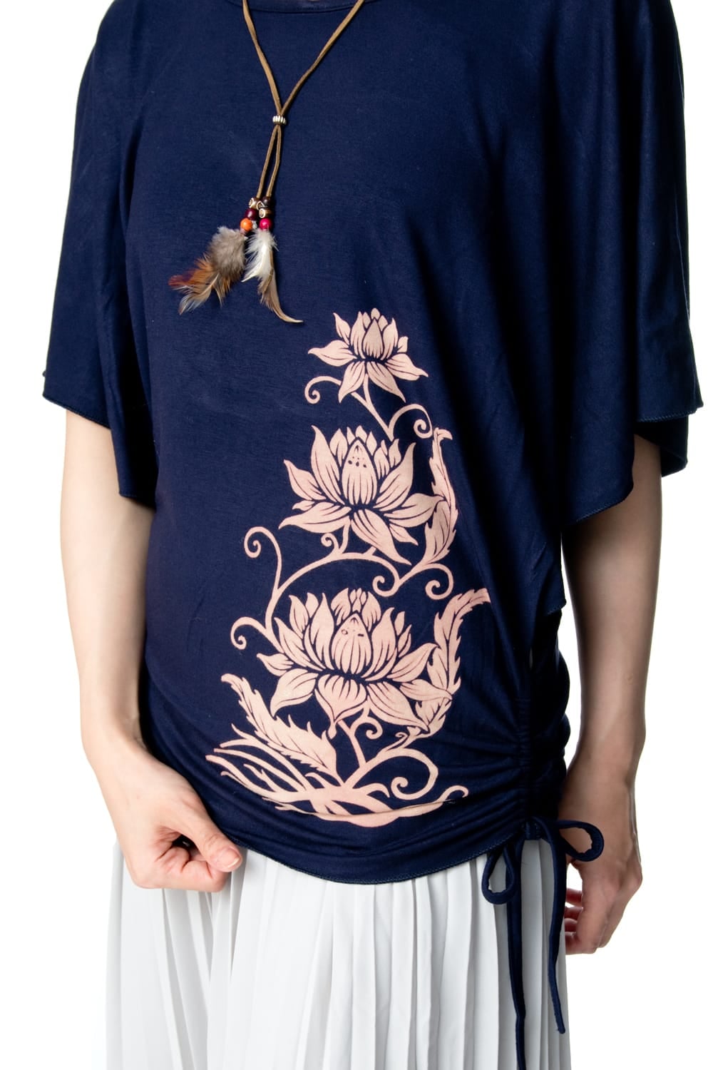 こちらのTシャツは二の腕周りをゆったりと隠しながらも、裾の紐を絞ってほどよく腰にフィットできるので、動きやすいし女らしいシルエットになります。