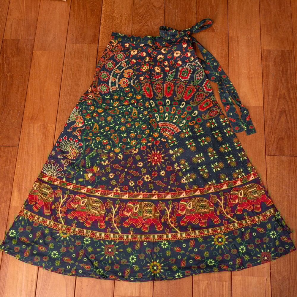ぐるっと巻き付けるタイプのラップスカート。サイズは関係なくどなたでもお楽しみいただけます。■インドらしい伝統柄が印象的