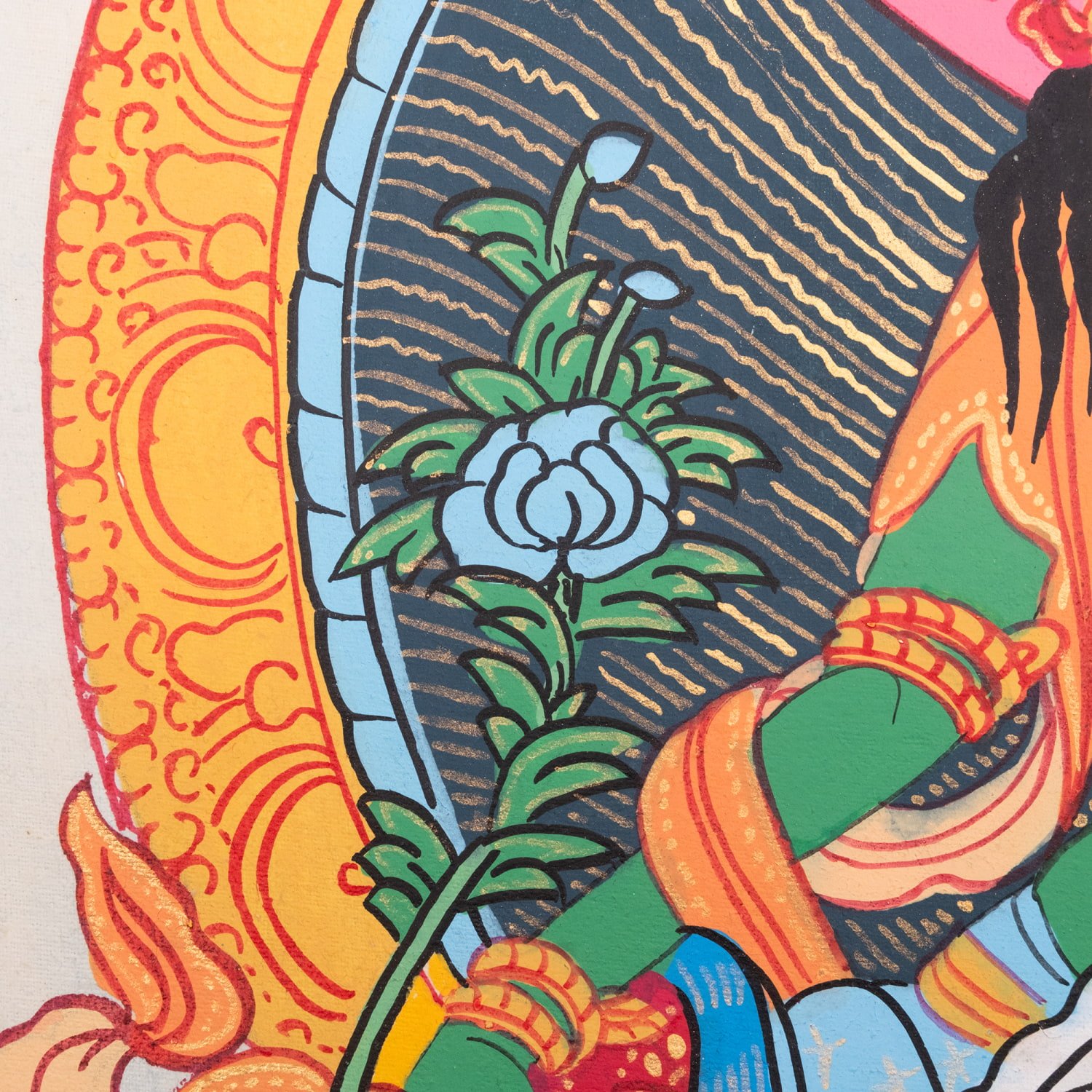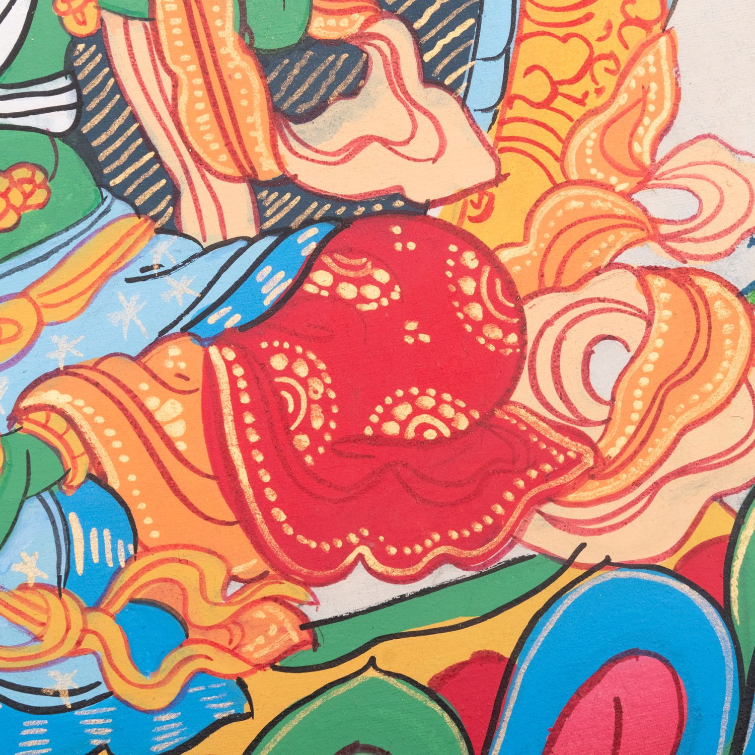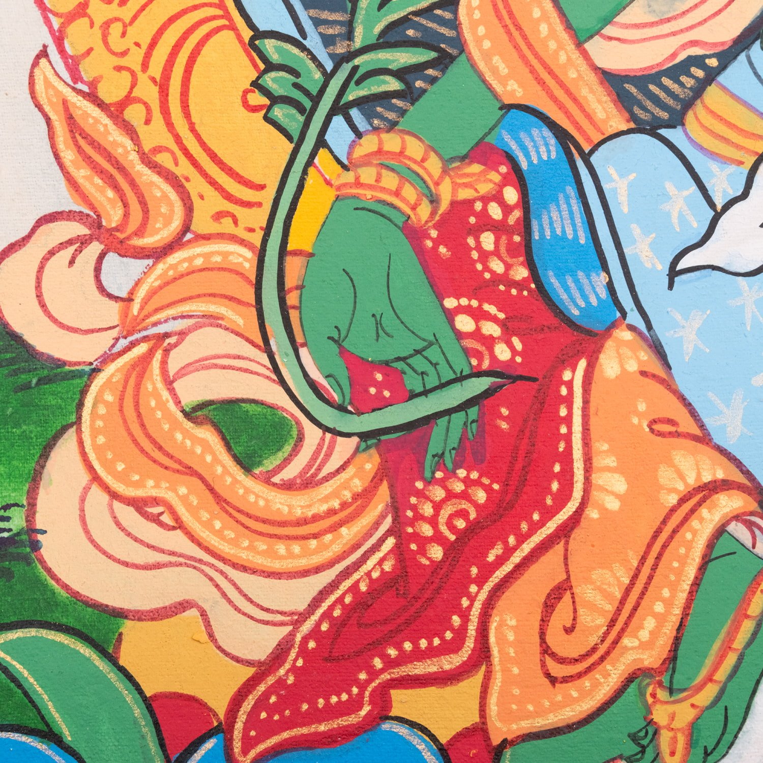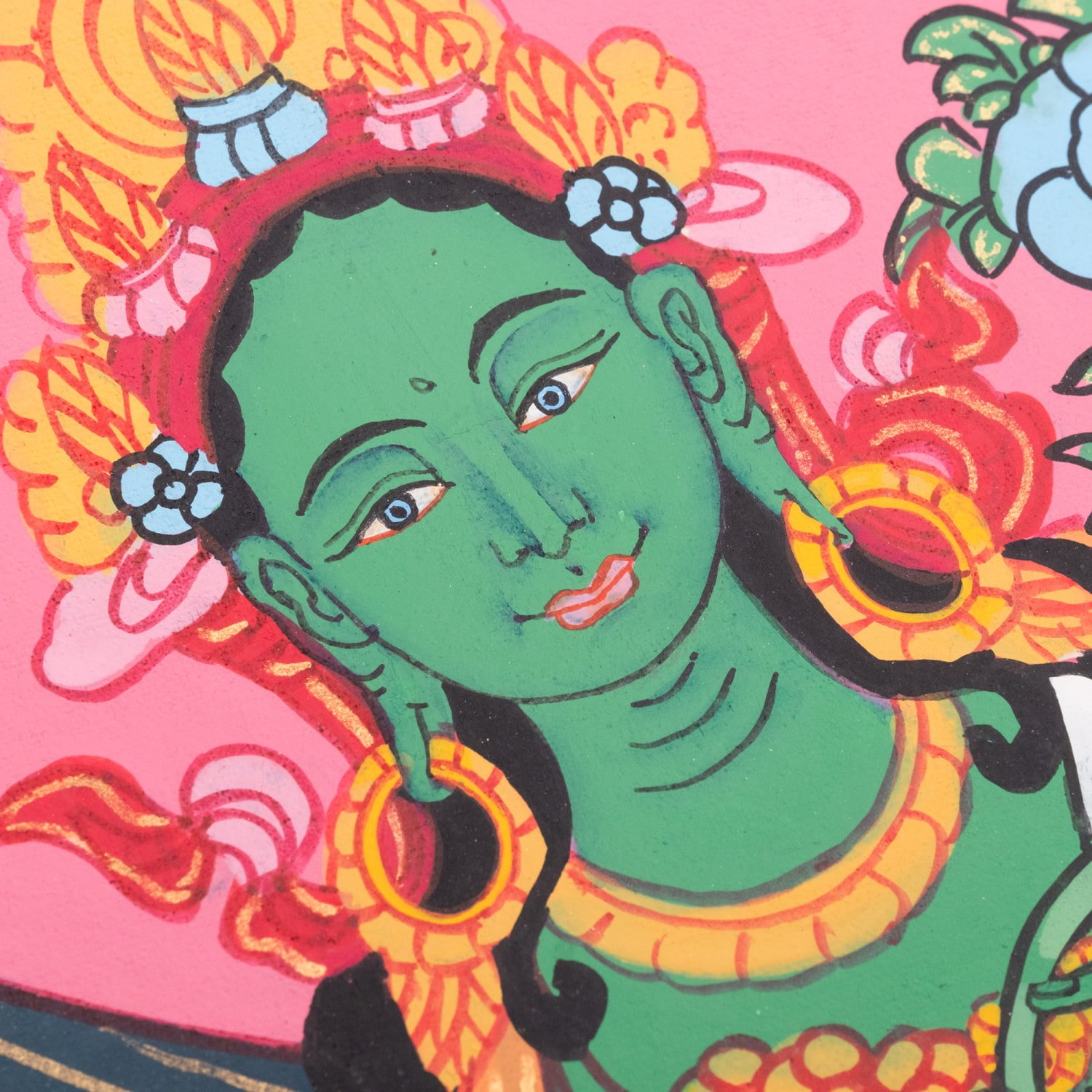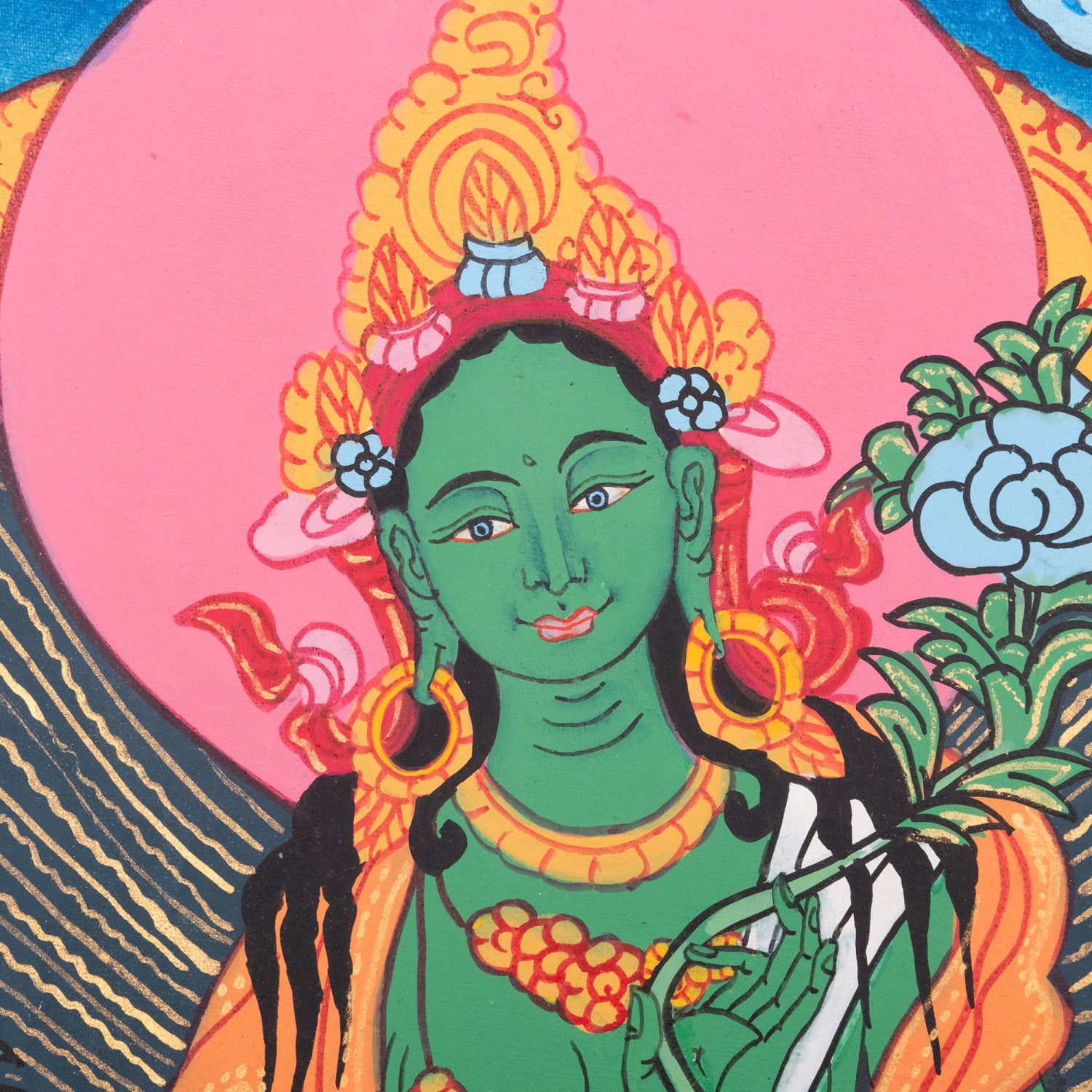 チベット仏教で古くから信仰される、慈悲の仏母「緑ターラ」を描いた美しいタンカです。緑ターラは“迅速な救済の女神”として知られ、障害や恐れを取り除き、守護を与えてくれる存在とされています。本作では鮮やかな緑の身体、蓮華の上に軽やかに坐する姿、右手に示される《恐れを取り除く施無畏印》が丁寧に描かれています。
