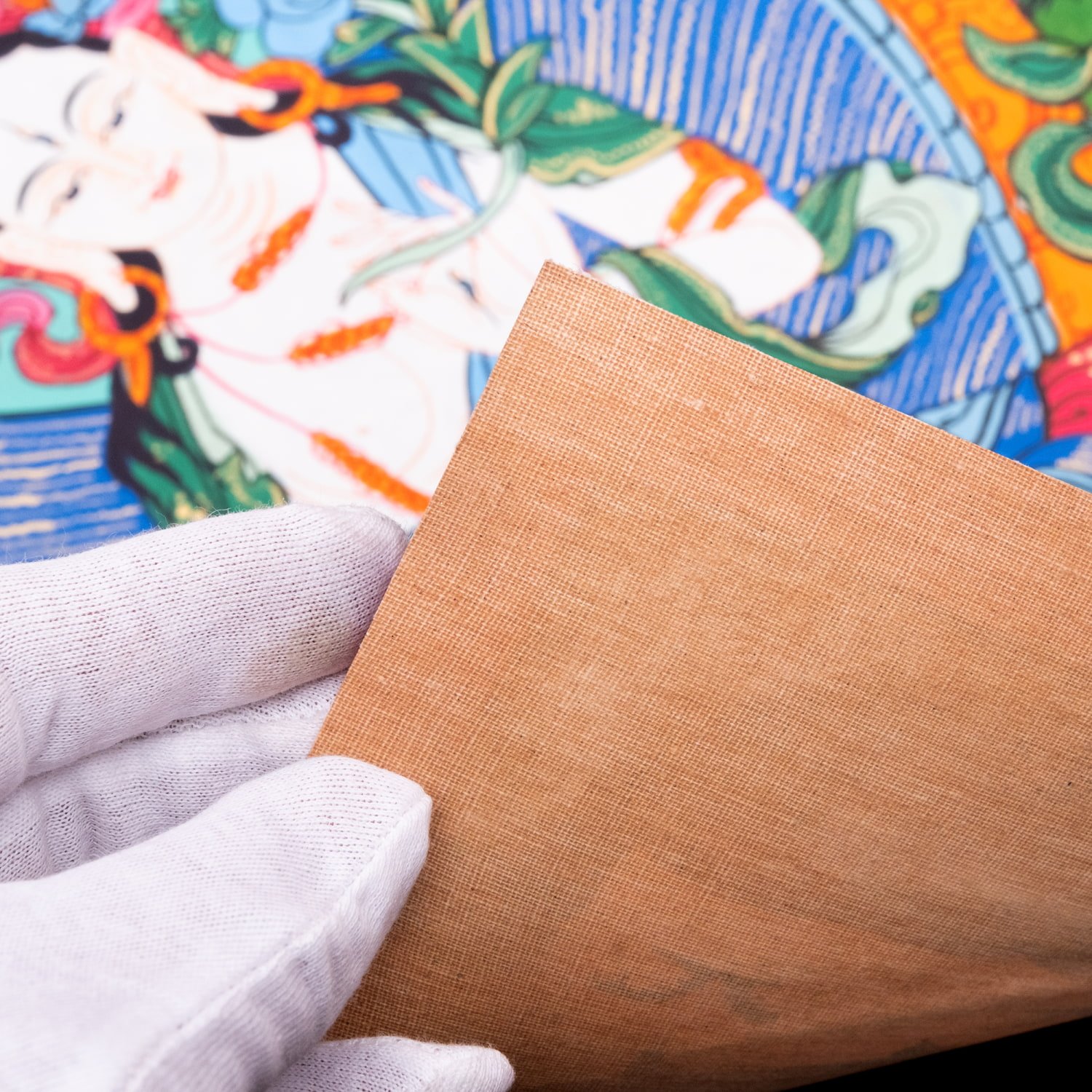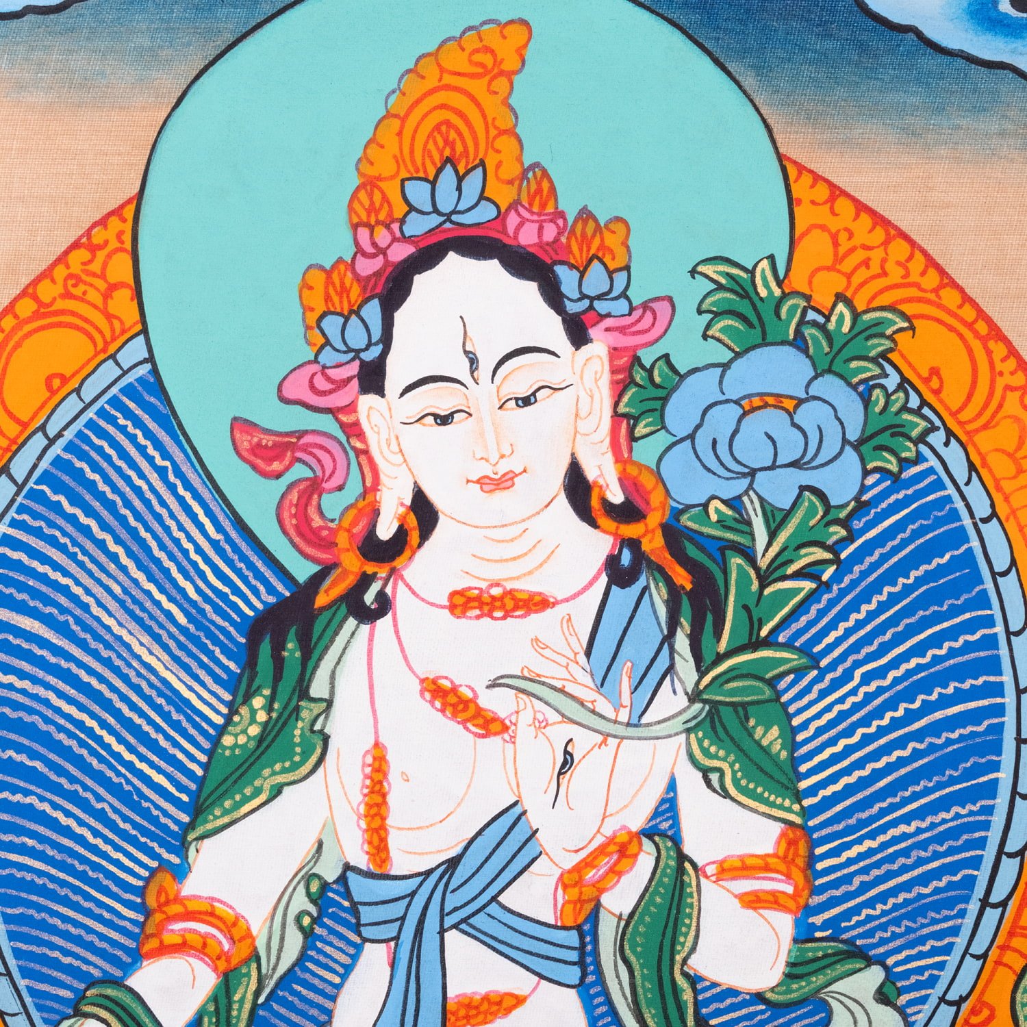 このタンカで描かれている、ホワイトターラはチベット仏教で非常に尊重される女神で、「長寿」「癒し」「平和」「慈悲」 を象徴する存在です。ターラは全21形があると言われ、その中でもホワイトターラは “優しさと保護の母” として、特に信仰されています。ホワイトターラの最も有名な特徴は 七つの眼です。両手・両足・額に加えて、合計七つの慈悲の目が描かれます。すべての方向の苦しみを見つけるため、どんな存在も見捨てないと言う意味があります。