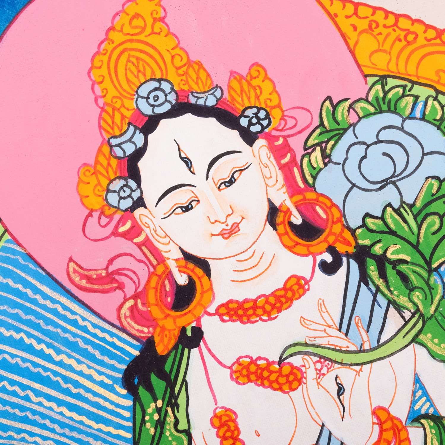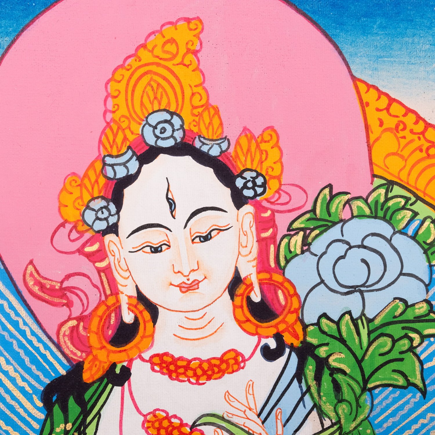 このタンカで描かれている、ホワイトターラはチベット仏教で非常に尊重される女神で、「長寿」「癒し」「平和」「慈悲」 を象徴する存在です。ターラは全21形があると言われ、その中でもホワイトターラは “優しさと保護の母” として、特に信仰されています。ホワイトターラの最も有名な特徴は 七つの眼です。両手・両足・額に加えて、合計七つの慈悲の目が描かれます。すべての方向の苦しみを見つけるため、どんな存在も見捨てないと言う意味があります。