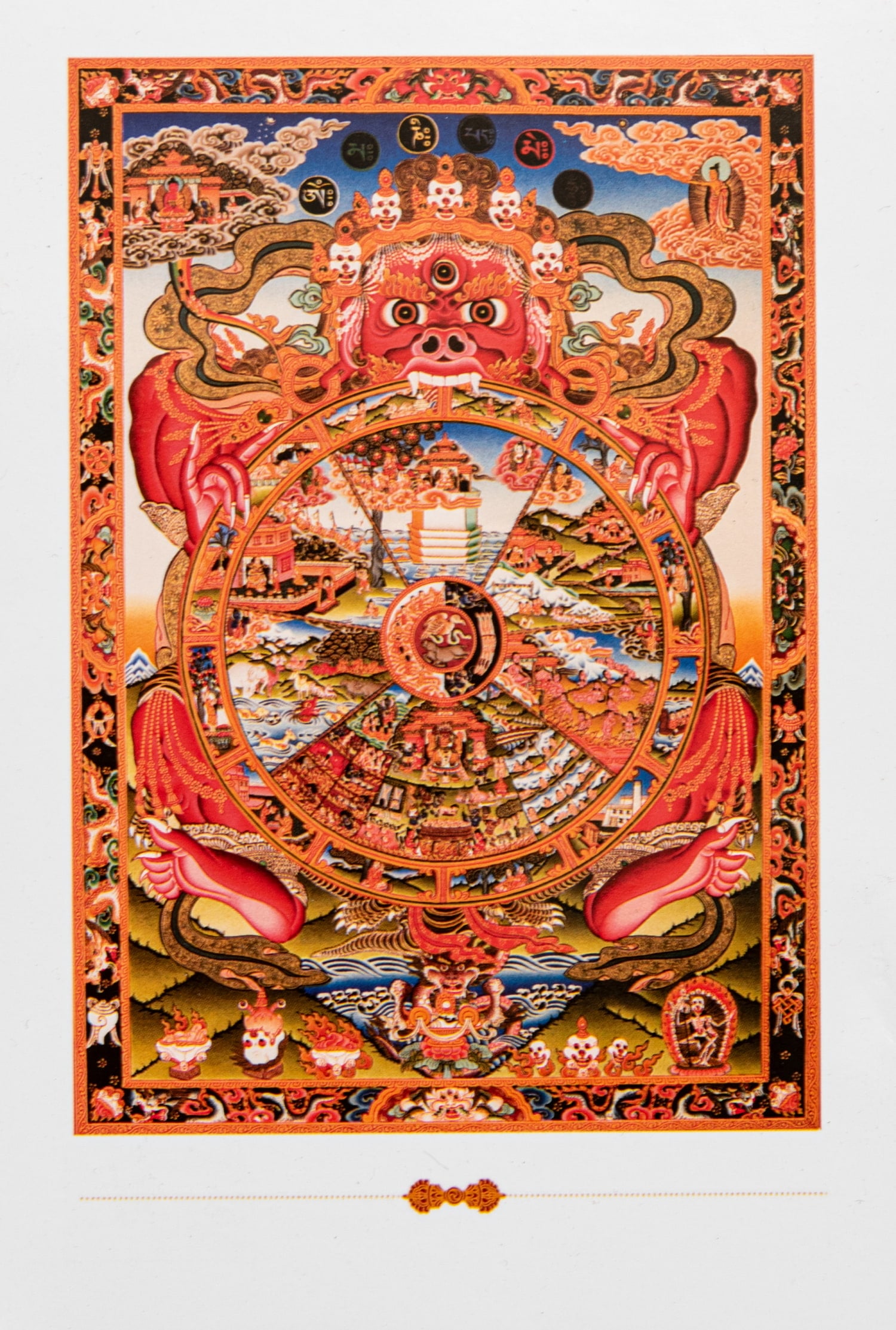 チベット文化に興味を持ち、ティラキタさんのHPを拝見して、これが一番チベットの輪廻転生の世界観を良く表していて、また、ポストカードの中で一番色彩が豊かで、美しかったのがこのタンカ。