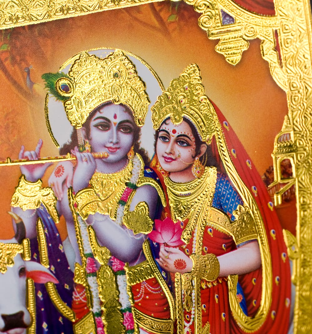 ヒンドゥー教の最高神であるヴィシュヌの7番目の化身といわれるクリシュナ。ビシュヌの化身の起源ともいわれ、強くて男前な、いわゆるプレイボーイの神様です。そんなクリシュナと恋人の娘、牛飼いのラーダとのポスターです。ヴィシュヌの化身のクリシュナに対し、ラーダはラクシュミーの化身とされています。「ギータ・ゴーヴィンダ」という二人を描いた叙事詩もあり、男女愛の象徴とされている二人です。