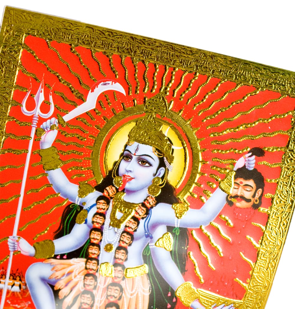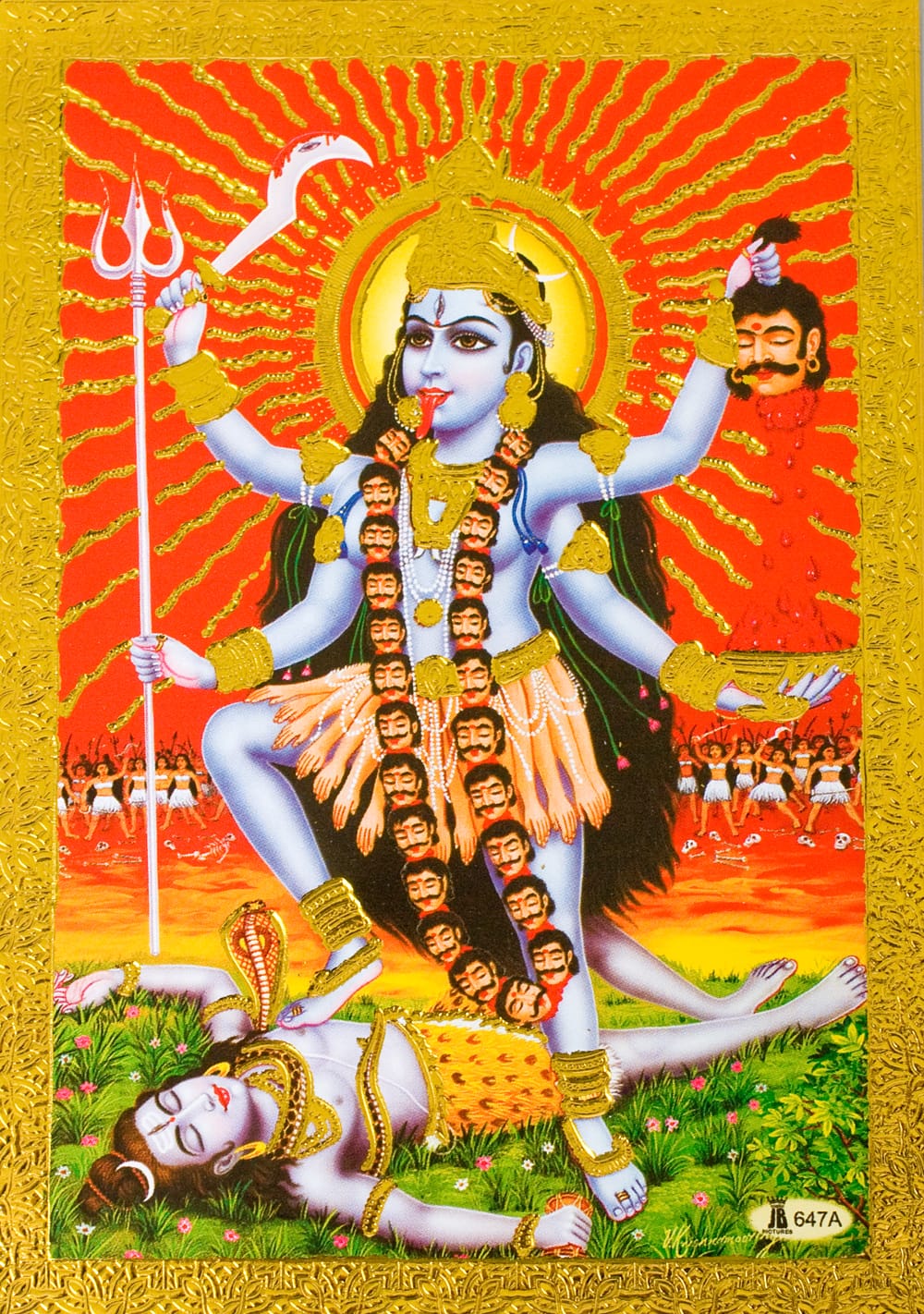 シヴァの奥さん・パールバティーの化身のひとつ、殺戮の神カーリーの像。血と酒と殺戮を好む戦いの女神で、シヴァの妻の一人であり、全身黒色で3つの目と4本の腕を持ち、チャクラを開き、牙をむき出しにした口からは長い舌を垂らし、髑髏をつないだ首飾りをつけ、切り取った手足で腰を被った姿で表されています。勝利に酔ったカーリーが踊り始めると、そのあまりの激しさに大地が粉々に砕けそうだったので、シヴァ神がその足元に横たわり、その衝撃を弱めなければならなかった……という伝説から、カーリーがでてくるとシヴァが横たわっている構図のものが多いです。踏まれているシヴァは涼し気な顔で懐の深さを感じますね。