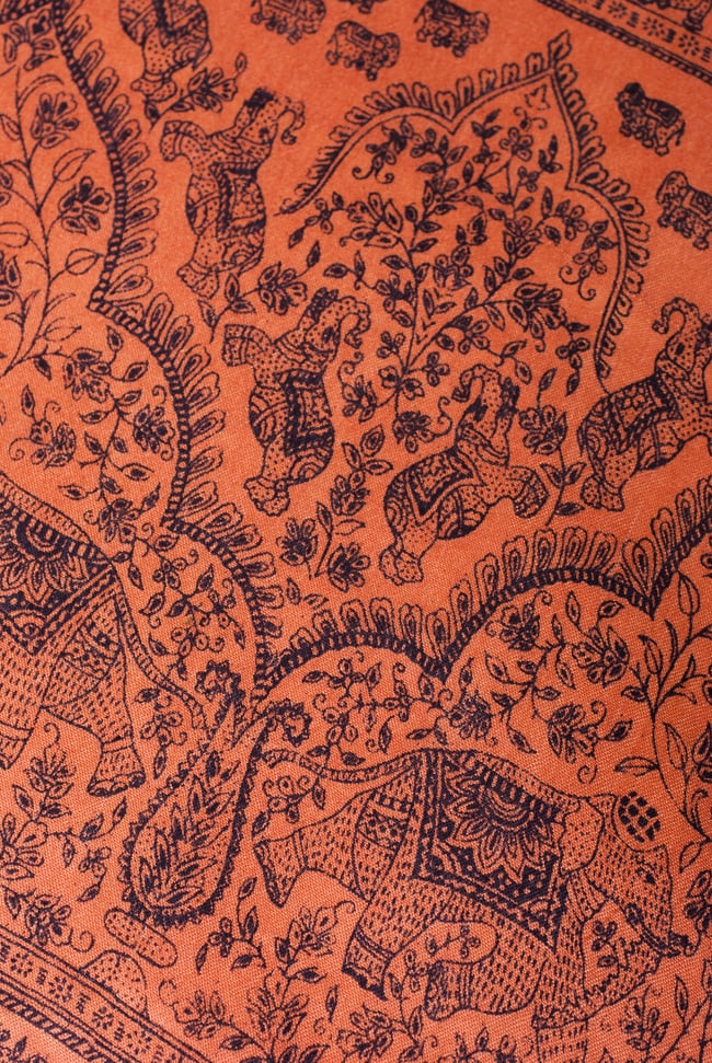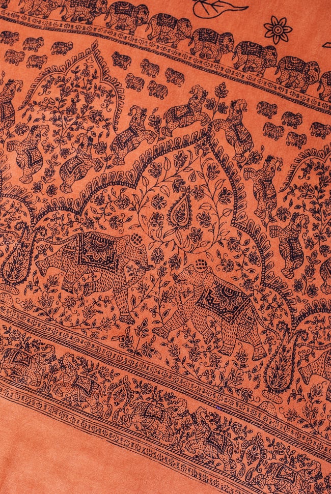 大きな樹木と象をモチーフにしたなめらかな手触りの便利布です。大きさは横1m、縦2m位の一番使いやすいサイズ。複雑に見える紋様の中にも象さんが練り歩いていて象好きにはたまらないファブリックです。ショール風に体に巻いたり、野外キャンプ時に日よけにしたり、頭に巻いてターバン風にしたり、 カーテンの代わりにしたり、ほこりよけとしてパソコンの上にかけたり、かばんの中に入れておいてちょっとした暖をとるのに使ったりと本当に自由自在です。色違いで何枚も欲しくなる、とっても便利な布です。