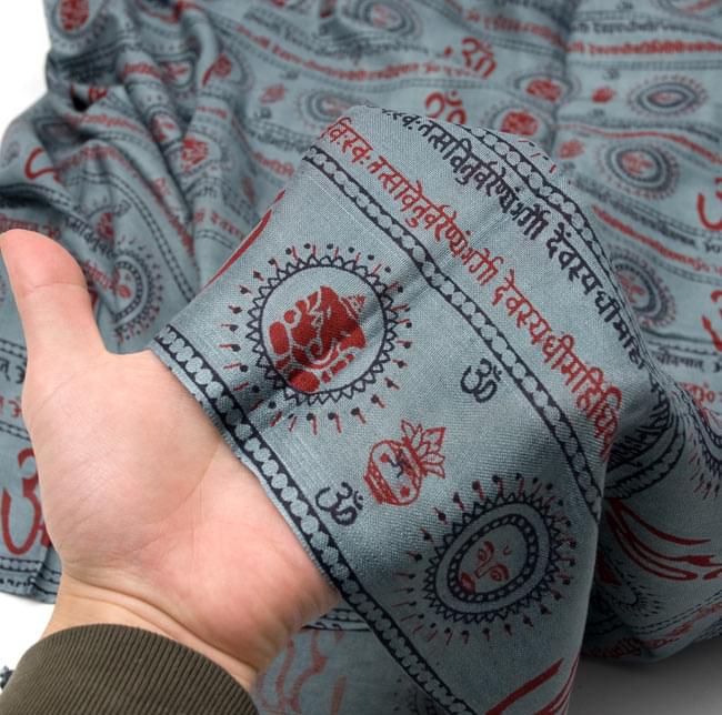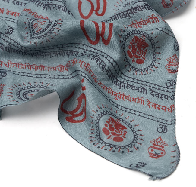 ヒンドゥー教の大聖地、バラナシ特産のラムナミ(神様布)。インド古来の文字「オーン」と太陽神「スーリア」、幸運と金運の神「ガネーシャ」などがプリントされた可愛い布地。肌触りの良い薄手の生地で、冬にはストールやマフラーとして、夏には日よけのショールなどとしてお使い頂けます。