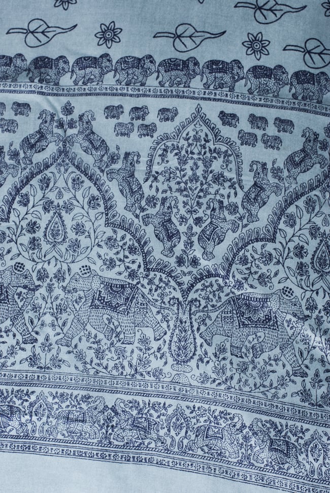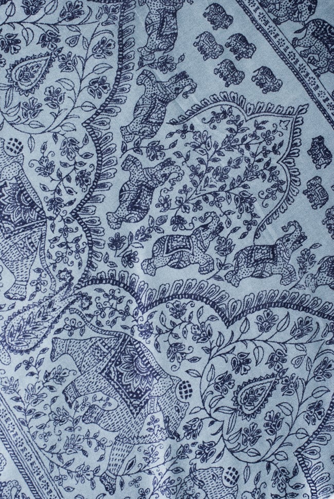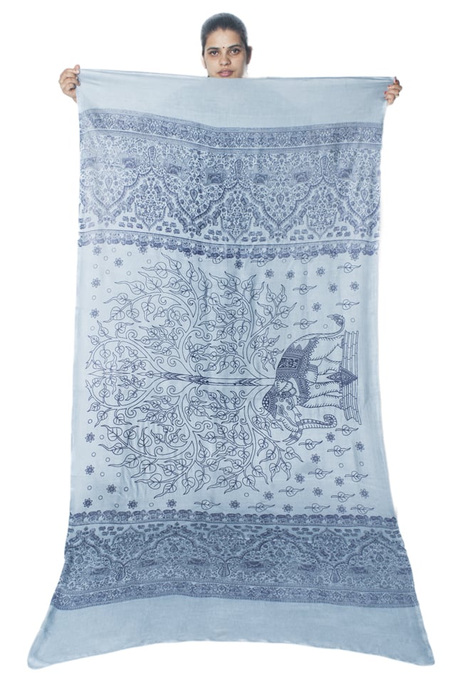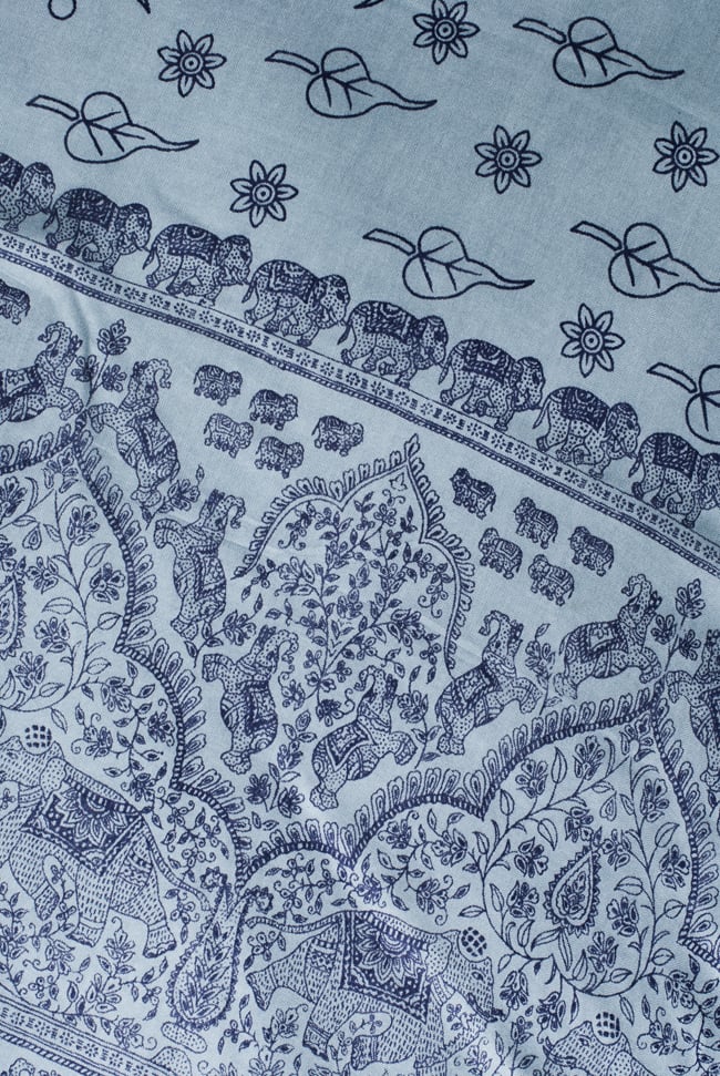 大きな樹木と象をモチーフにしたなめらかな手触りの便利布です。大きさは横1m、縦2m位の一番使いやすいサイズ。複雑に見える紋様の中にも象さんが練り歩いていて象好きにはたまらないファブリックです。ショール風に体に巻いたり、野外キャンプ時に日よけにしたり、頭に巻いてターバン風にしたり、 カーテンの代わりにしたり、ほこりよけとしてパソコンの上にかけたり、かばんの中に入れておいてちょっとした暖をとるのに使ったりと本当に自由自在です。色違いで何枚も欲しくなる、とっても便利な布です。