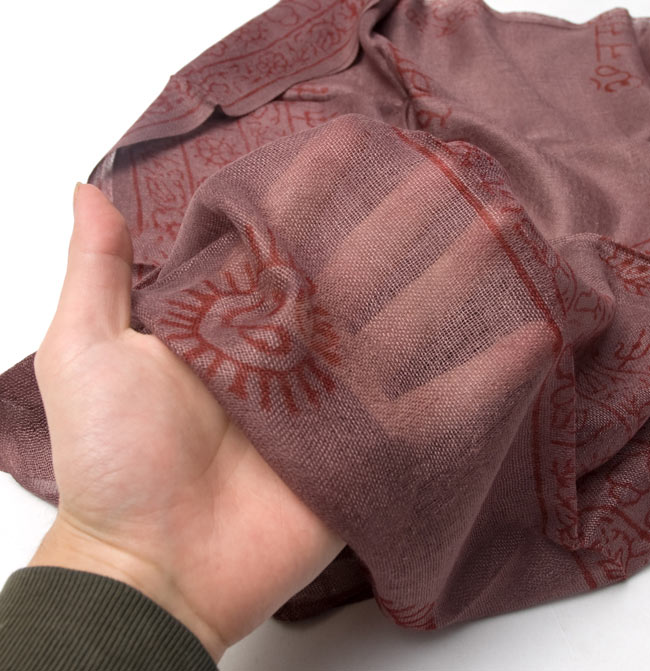 この「[約125cm×50cm]インド薄ラムナミ【小】 - 青灰」はグレーで赤茶の模様入りです。縦に四つ折りに畳んで首に巻き残った部分を絡めてトップスの中に入れて使っています。
