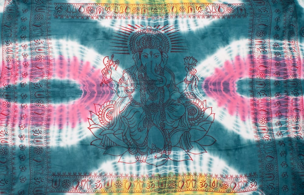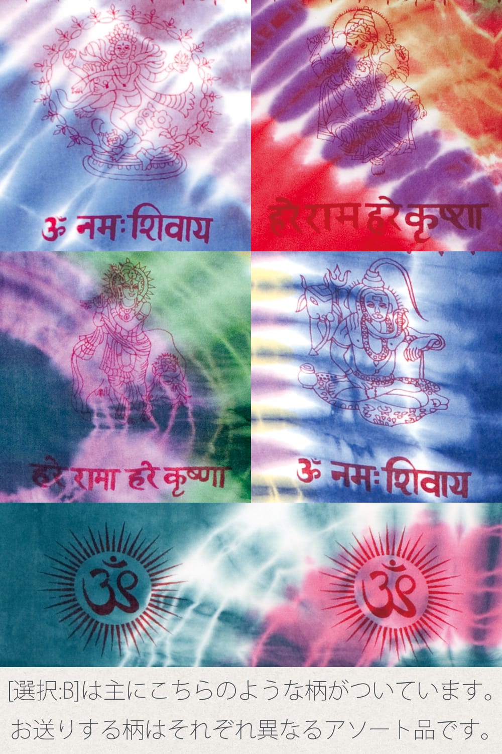 一般的なラムナミは基本的に単色で染められていますが、こちらは珍しく美しいタイダイ染めが施されております。神秘の国インドの文化と、精神世界を垣間見るゴア-ヒッピー文化の影響を強く受けた魅惑の布です。■大きなガネーシャやヒンドゥー神様柄