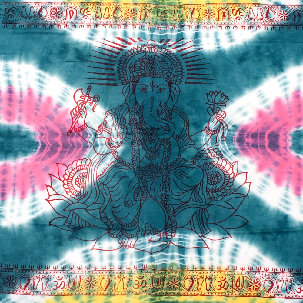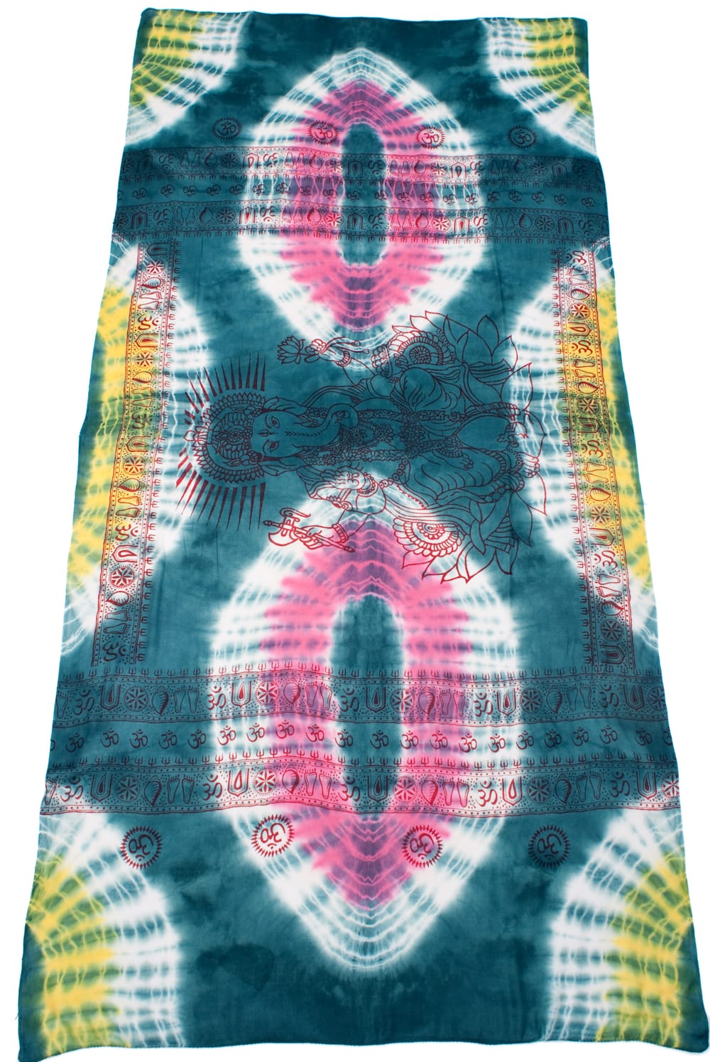 〔195cm*100cm〕ガネーシャ&ヒンドゥー神様のタイダイサイケデリック布 - 青緑×ピンク×黄色系 通販店