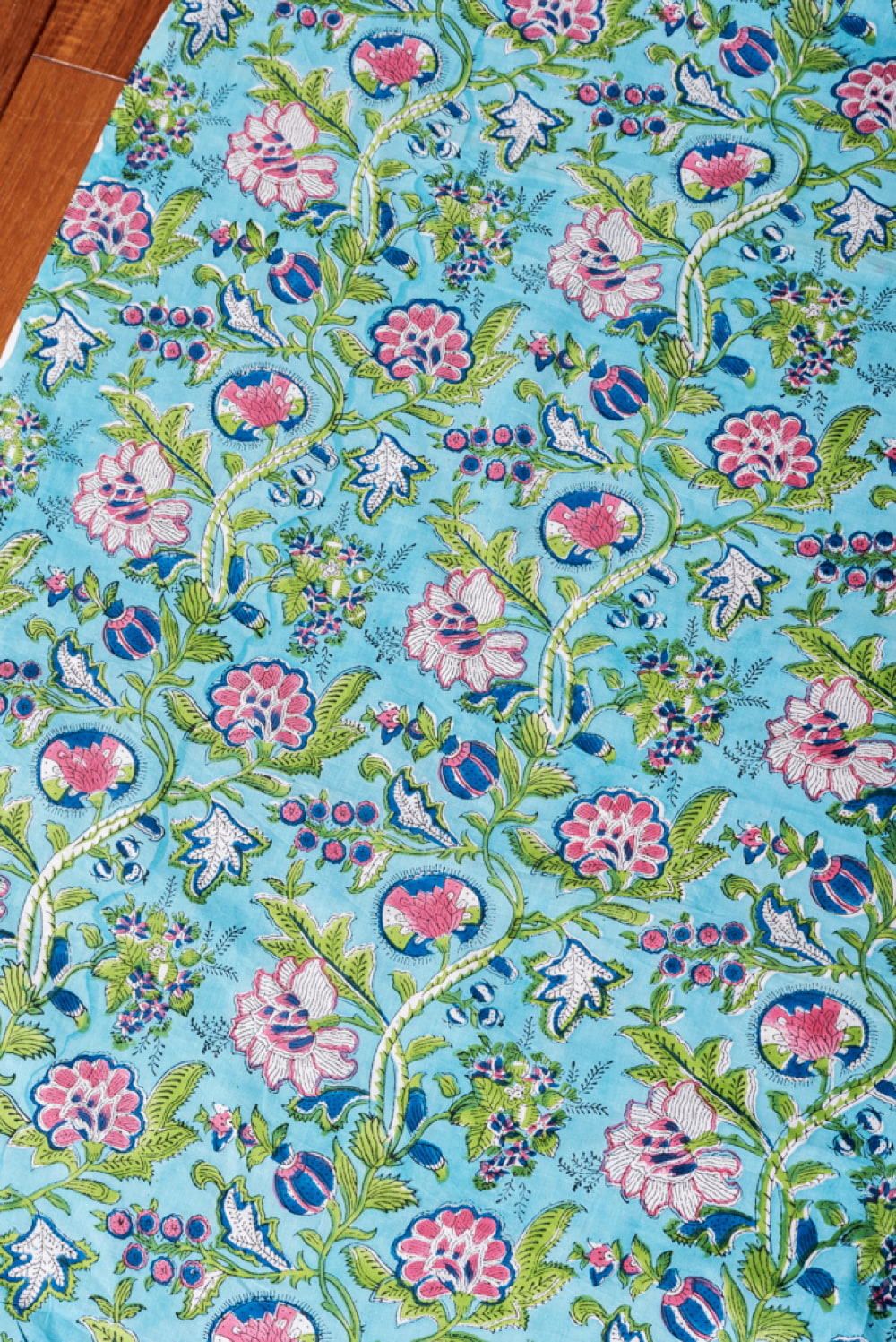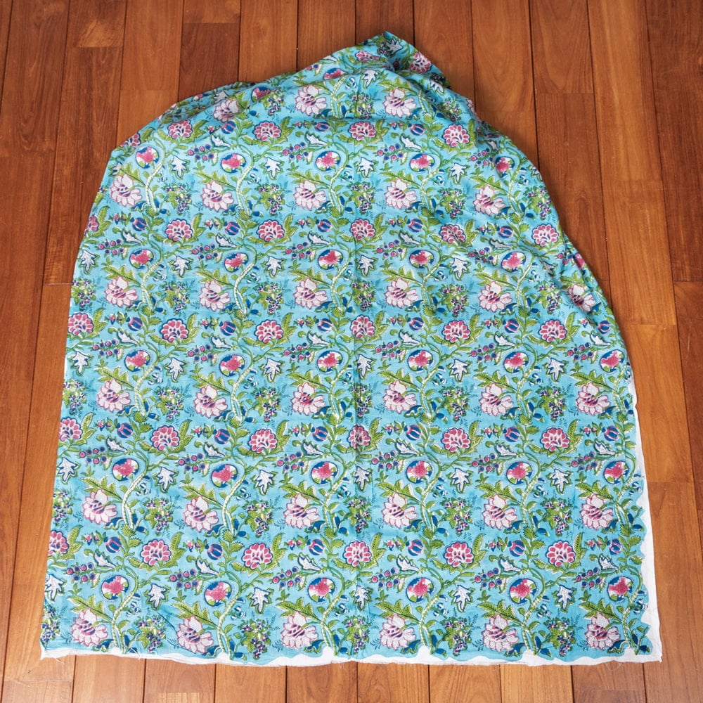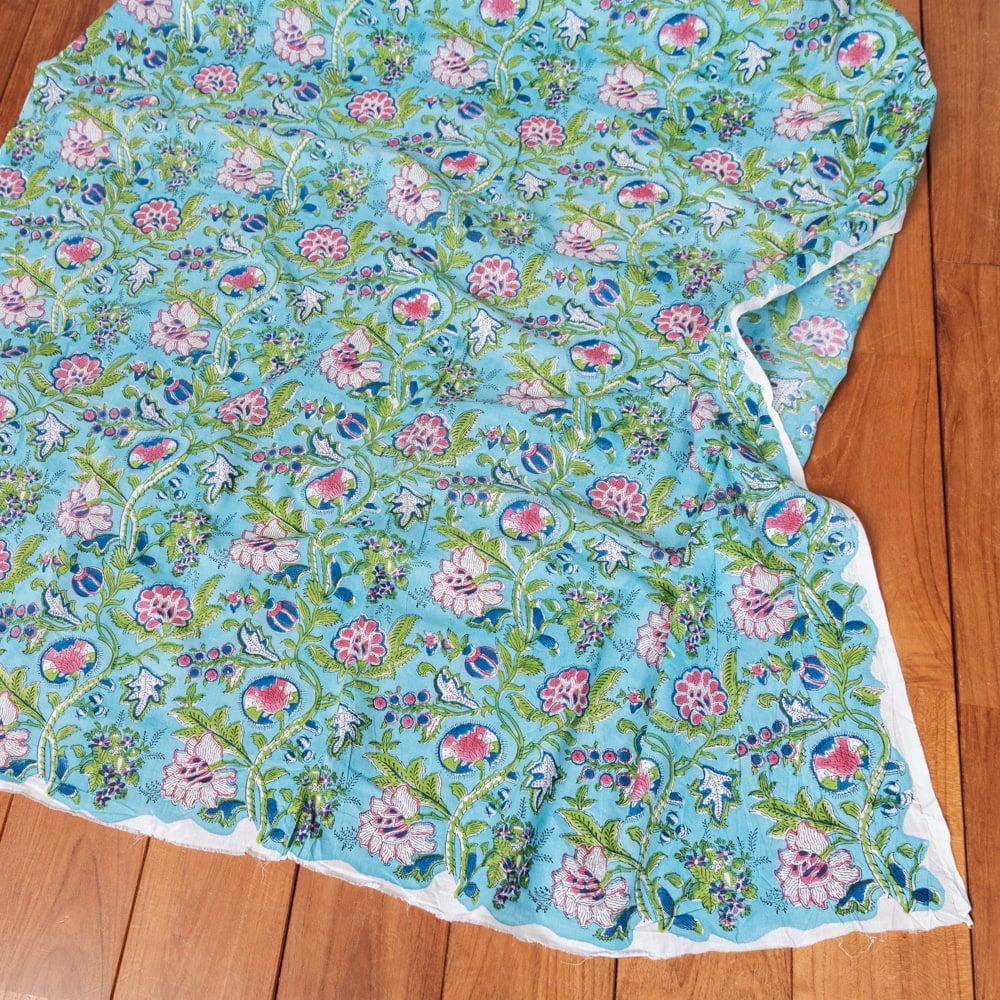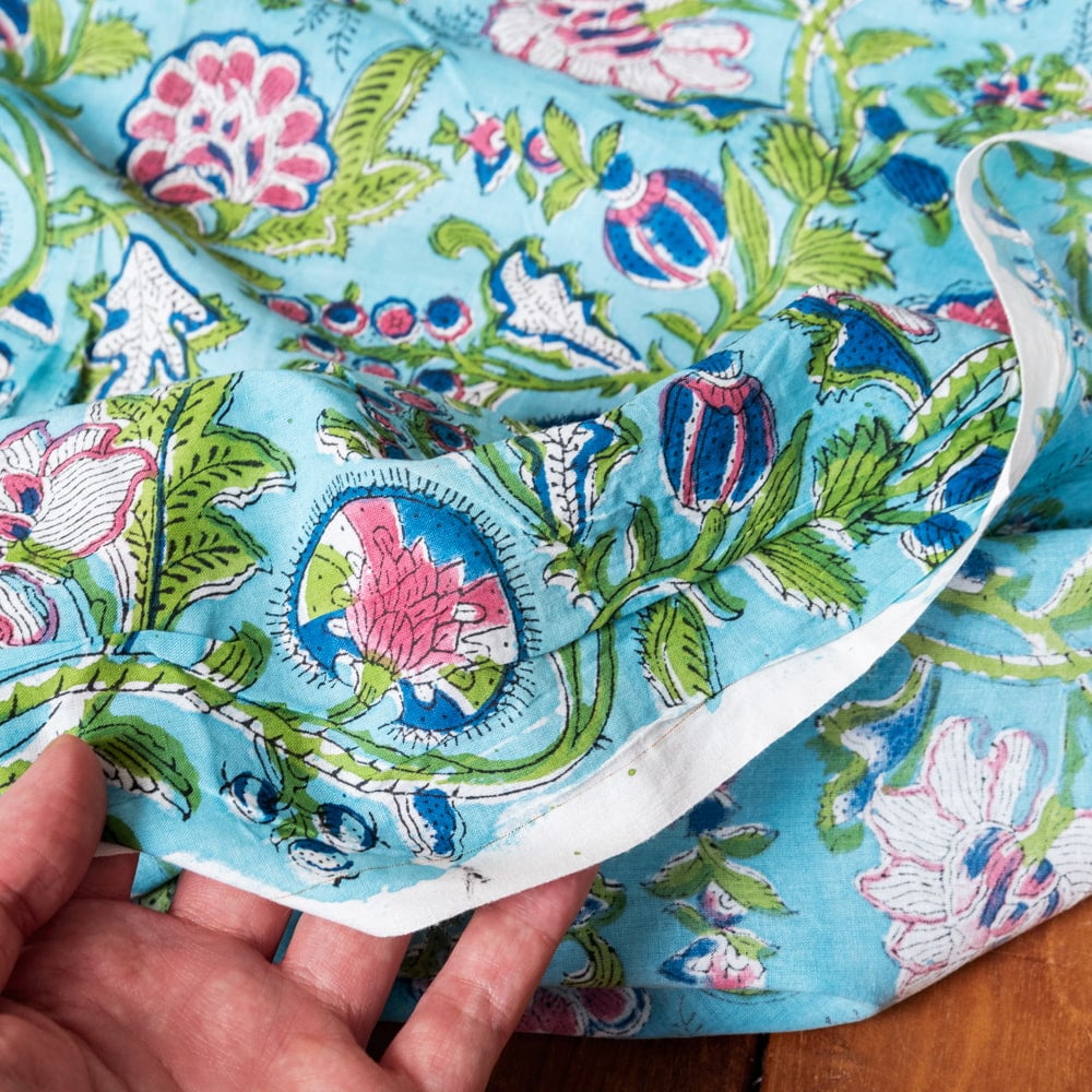 〔1m単位切り売り〕ジャイプル 職人手作り木版染め 色彩美しいボタニカルデザイン おしゃれ 生地 花柄 テーブルクロス 刺繍素材などへ〔幅約107cm〕 - ブルーグリーン系
