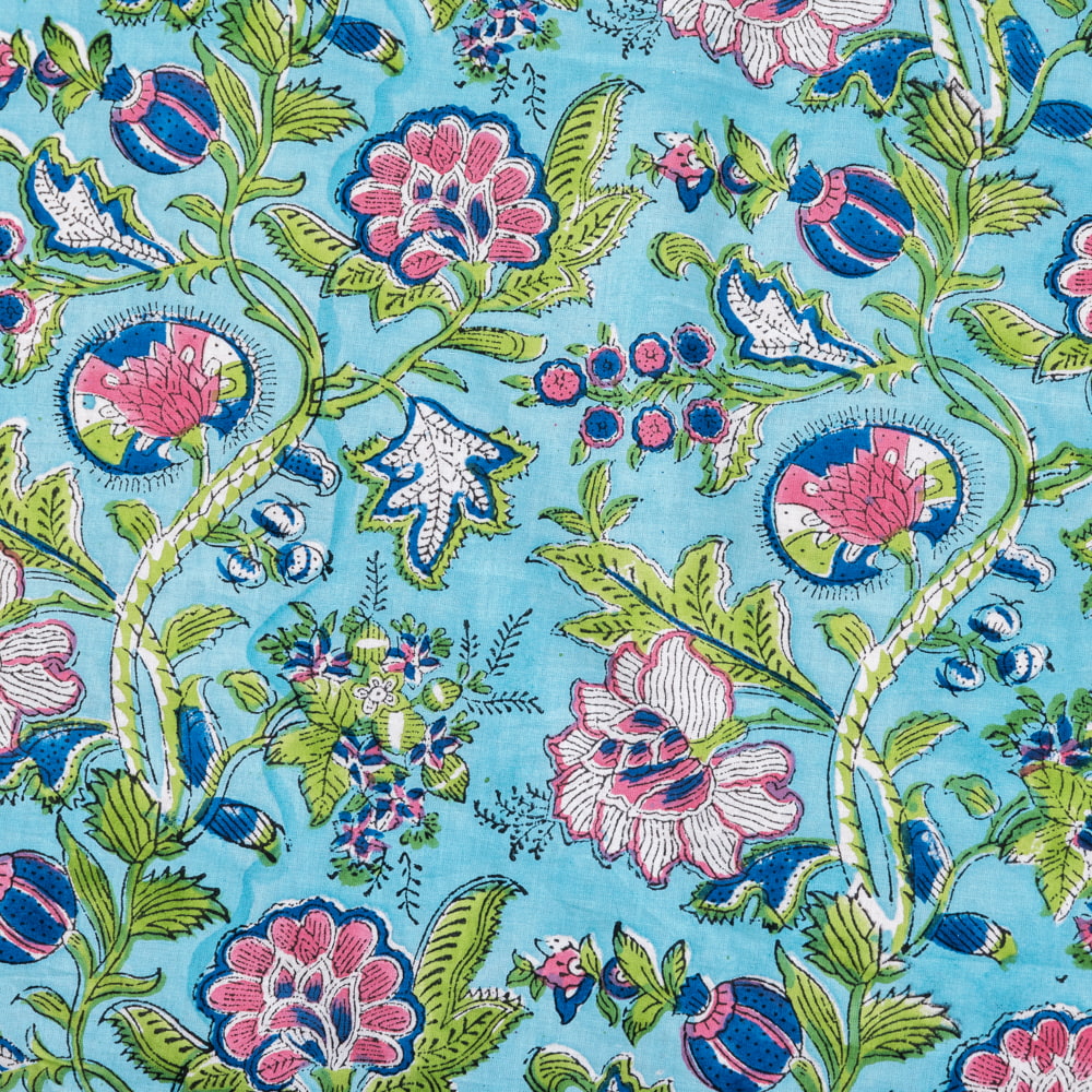 〔1m単位切り売り〕ジャイプル 職人手作り木版染め 色彩美しいボタニカルデザイン おしゃれ 生地 花柄 テーブルクロス 刺繍素材などへ〔幅約107cm〕 - ブルーグリーン系 通販店