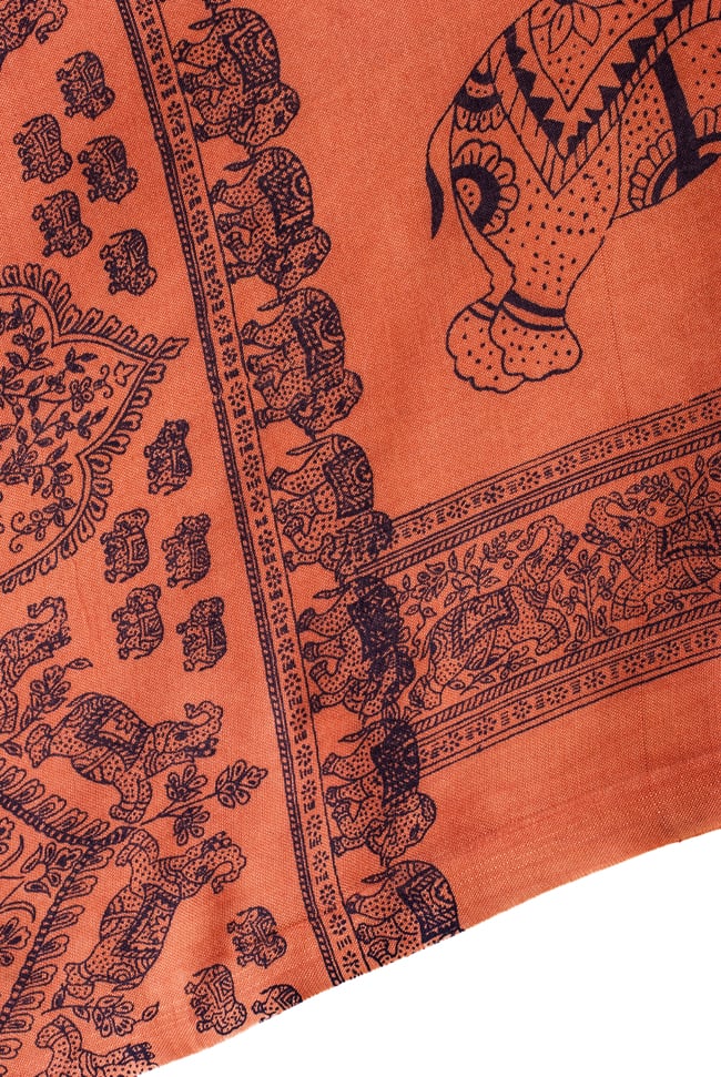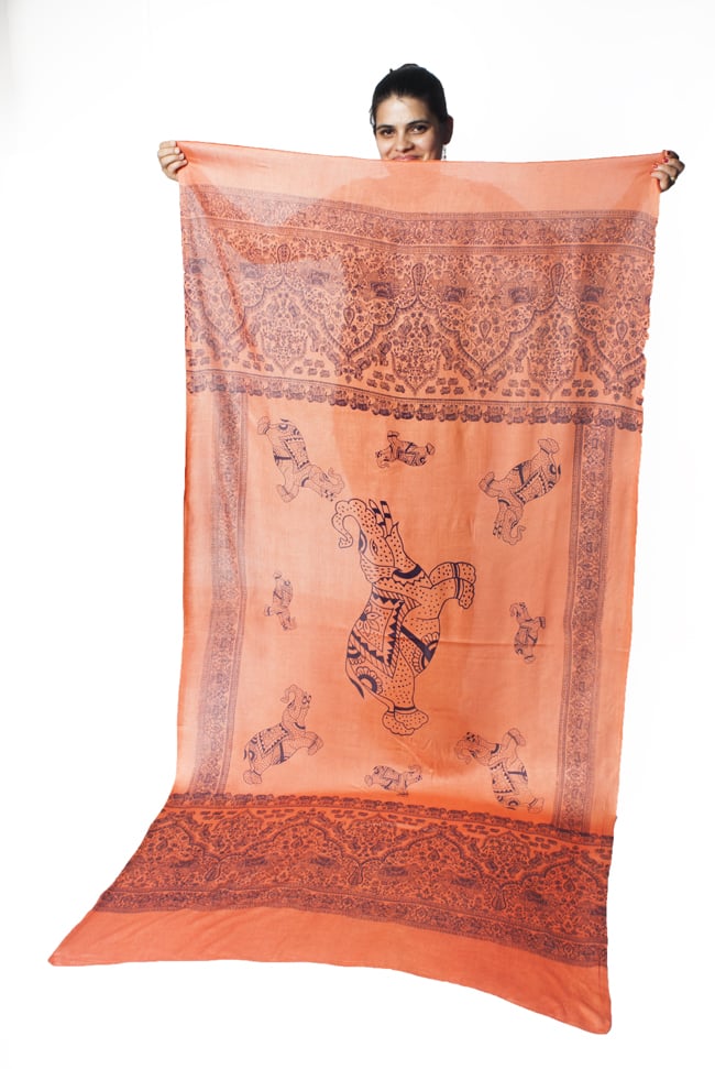インドの伝統模様に、可愛い象さん柄が入った程よい大きさの布です。大きさは横1m、縦2m位の一番使いやすいサイズ。ショール風に体に巻いたり、野外キャンプ時に日よけにしたり、頭に巻いてターバン風にしたり、 カーテンの代わりにしたり、ほこりよけとしてパソコンの上にかけたり、かばんの中に入れておいてちょっとした暖をとるのに使ったりと本当に自由自在です。色違いで何枚も欲しくなる、とっても便利な布です。