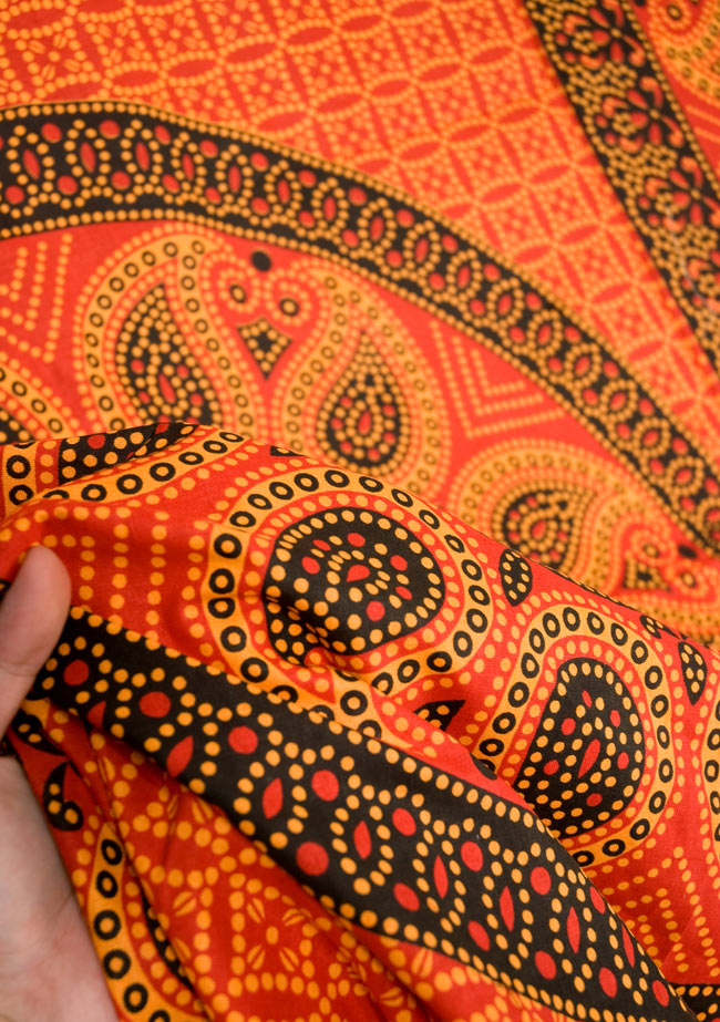 大きな布にとても丁寧に、インド伝統の唐草柄やマンダラ柄、象さんや、お花などがプリントされているので、こちら1枚をお部屋に飾るだけでアジアンなお部屋に大変身!■人の手の温もりを感じる伝統的手法