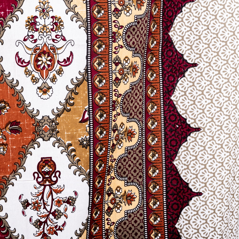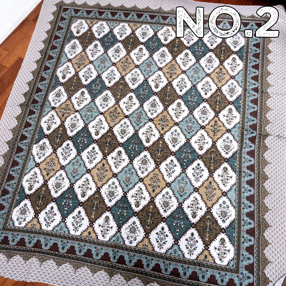 サイズは大きく、長い面は190〜200cmを超える迫力のあるダブルベッドサイズ。インド現地ではベッドカバーとして使われているものですが、壁掛けやテーブルクロス、お部屋のカーテン、そしてもちろん、ベットカバーとして幅広くご利用頂けます。