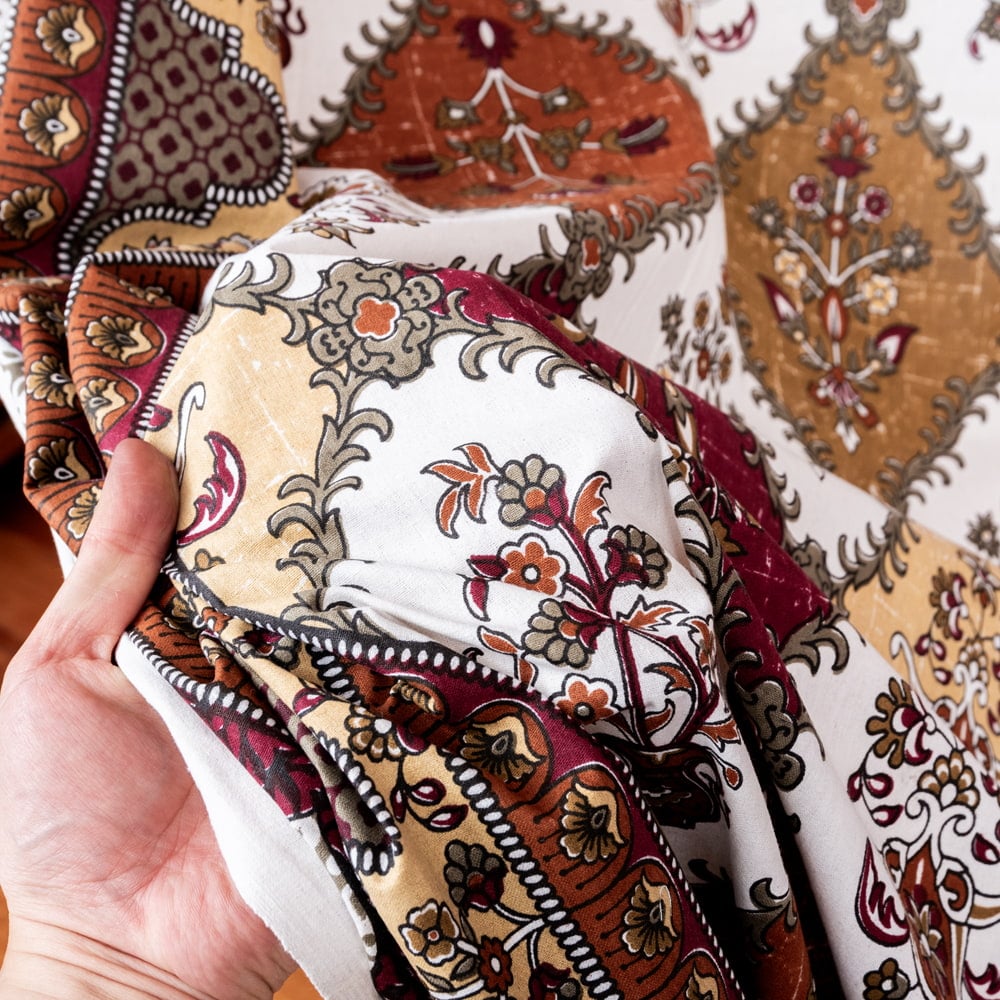 いかにもインドらしいモチーフが魅力的なインド綿のマルチクロスです。インドコットンに、ラクダやゾウ、ペイズリーやマンダラ模様など、インドならではのデザインをプリントしました。