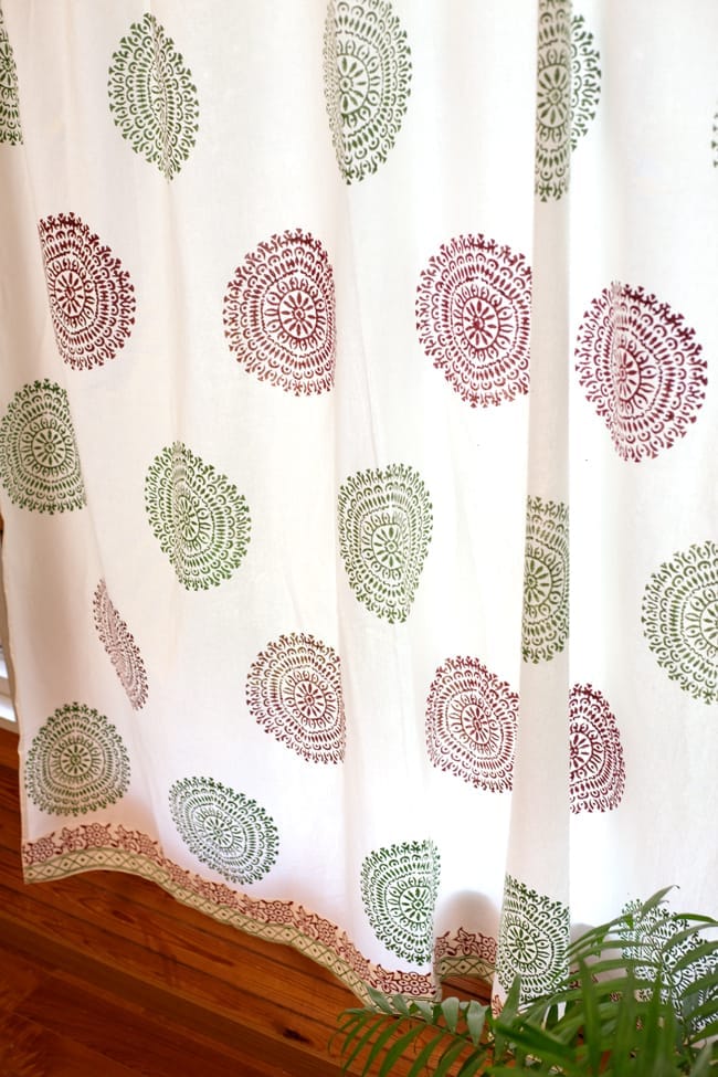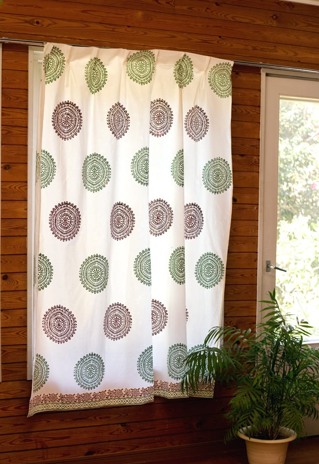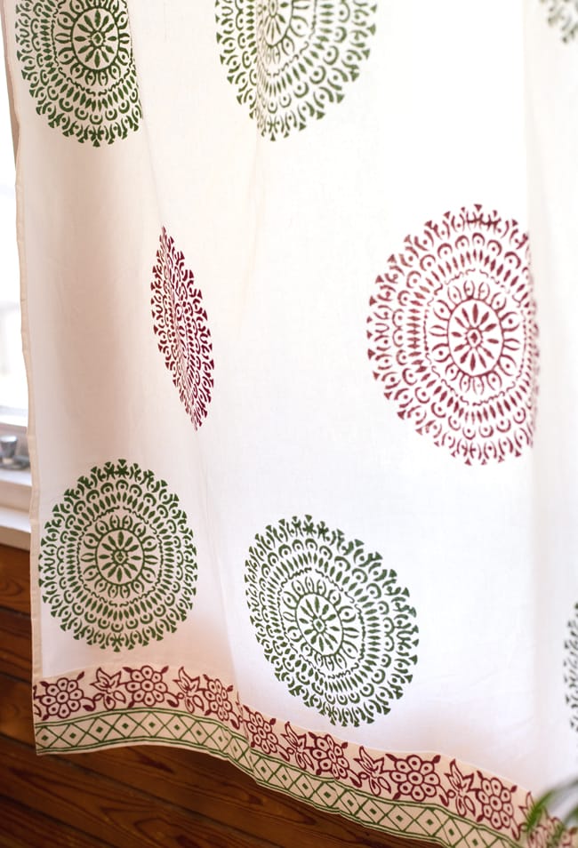 〔100cm×176cm〕インドの木版染め 手作りウッドブロックプリントのホワイトカーテン - 緑×ワイン系 ランゴリ柄 通販店