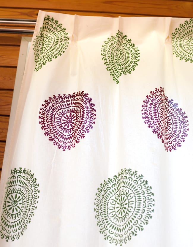 | 備考 | 一般的なカーテンフックで取り付けられますが、あまり太いタイプだと入らないことがございます。また、カーテンフックは付属いたしません。インド綿の為、若干のほつれや、染みなどがあることがございます。生地が裁断された部分により、商品画像とは模様の位置などが異なる場合がございます。また、基本的には人の手で作られているハンドメイド製品の為、サイズ等は表記と若干相違することがございます。予めご了承くださいませ。 |
