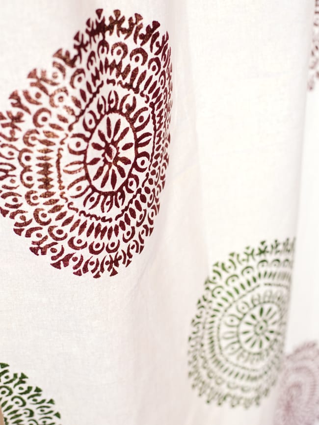 〔100cm×176cm〕インドの木版染め 手作りウッドブロックプリントのホワイトカーテン - 緑×ワイン系 ランゴリ柄の類似商品