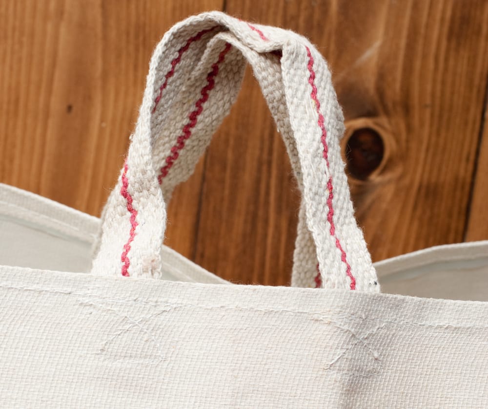 帆布の裏にはビニールがラミネートされ、防水加工が施されています。持ち手のデザインは多少異なる場合がございます