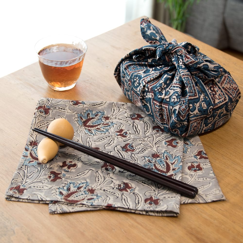 エスニックな風合いが素敵です。お弁当を包むのに使っています。この系統の染めものは色落ちするので、手で洗ってから使っています。