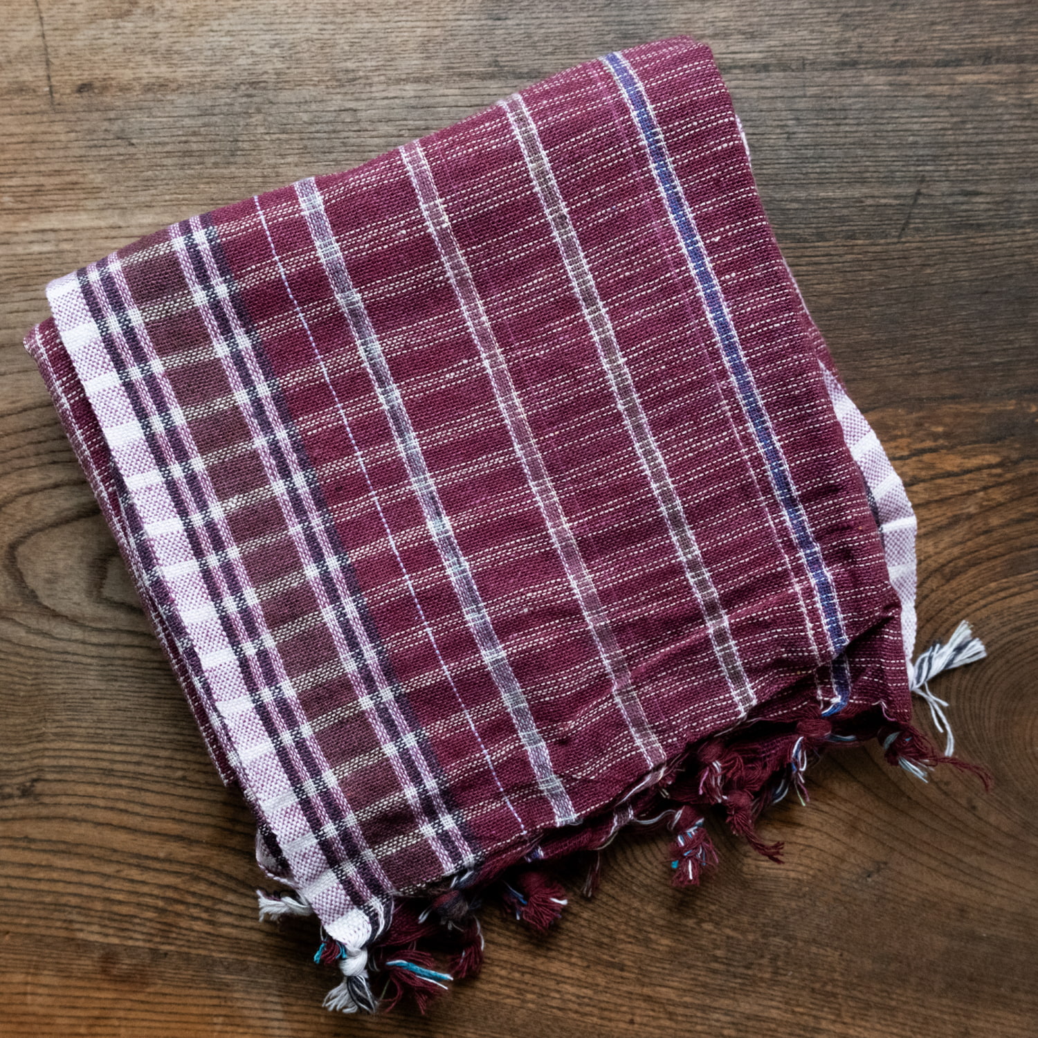 パープルを購入。思った通り優しくて良い色合いでした。比較的ざっくりと、目が粗めですが柔らかく薄い生地です。晒しの布巾みたいな感じかな。薄い色のせいか色落ちもほとんど無く、乾きも良いですが、フリンジの結び目が大きめなので、そこだけが他よりも乾きにくいです。レビューを全部見る