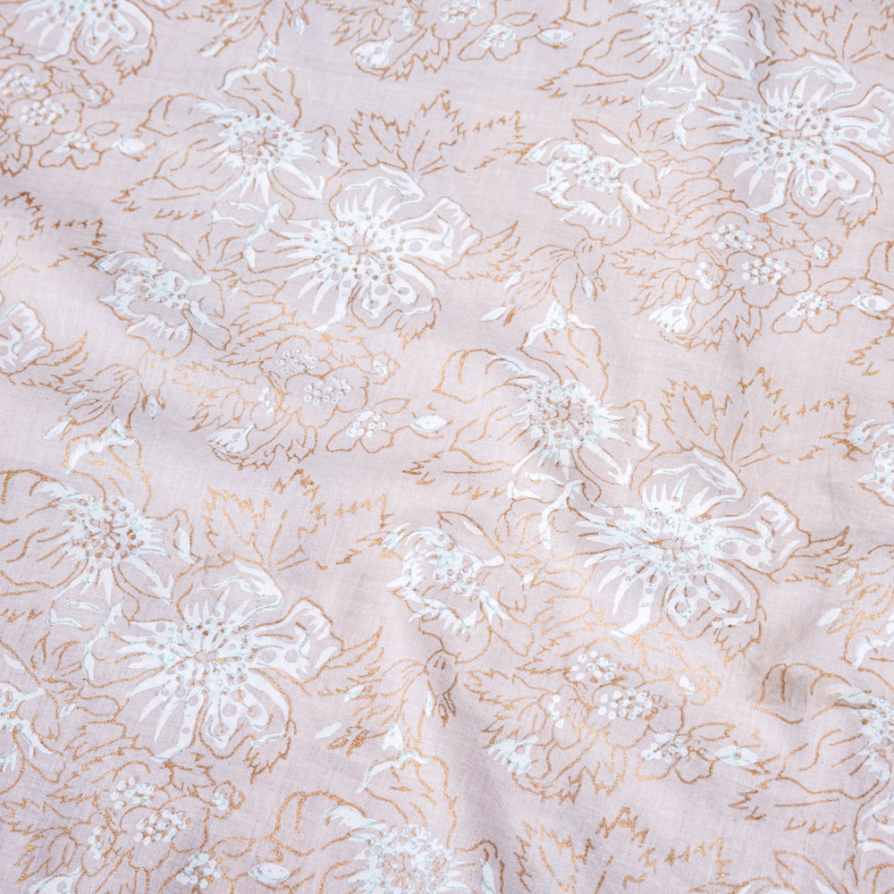 〔1m単位切り売り〕ジャイプル職人手作り 白生地×ゴールドプリントのボタニカルデザイン インド伝統の木版染め更紗生地〔幅約106cm〕の商品写真 5枚目 生地の拡大写真です。とても良い風合いです。