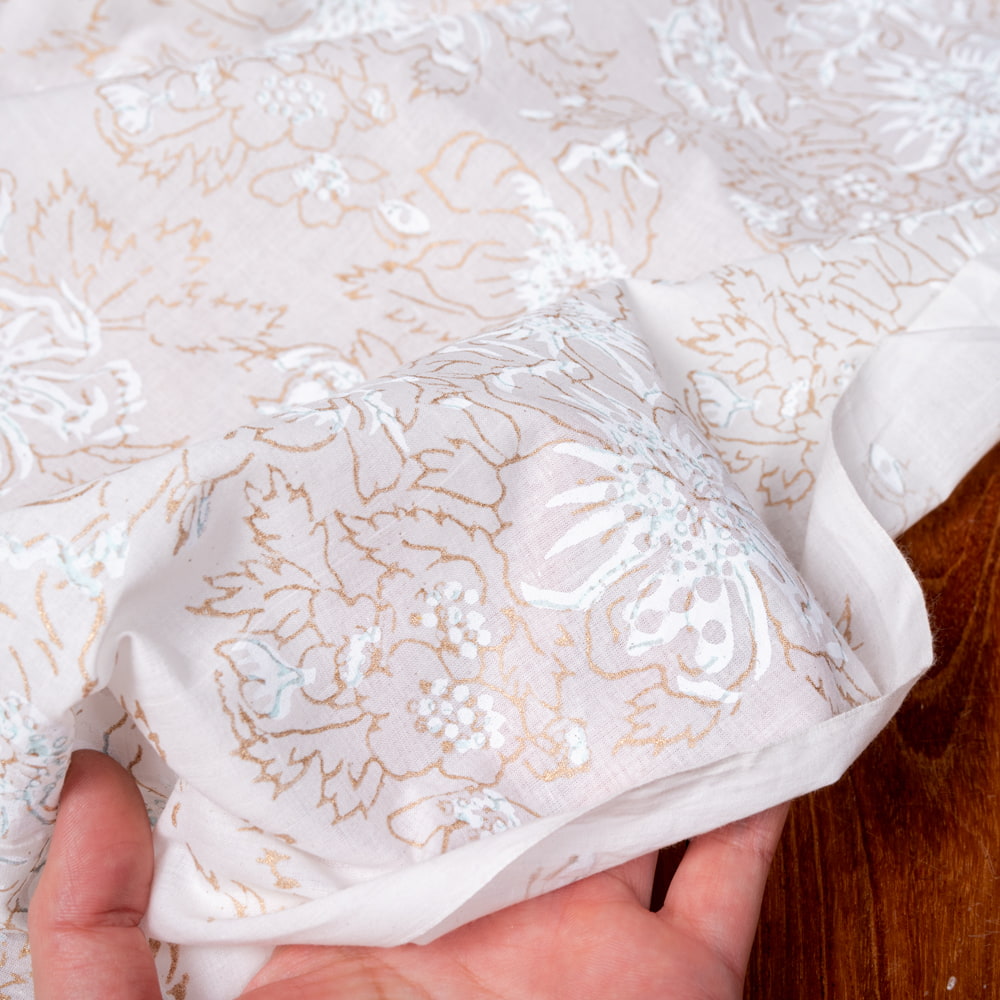 〔1m単位切り売り〕ジャイプル職人手作り 白生地×ゴールドプリントのボタニカルデザイン インド伝統の木版染め更紗生地〔幅約106cm〕の写真〔1m単位切り売り〕ジャイプル職人手作り 白生地×ゴールドプリントのボタニカルデザイン インド伝統の木版染め更紗生地〔幅約106cm〕 2 - とても素敵な雰囲気です〔1m単位切り売り〕ジャイプル職人手作り 白生地×ゴールドプリントのボタニカルデザイン インド伝統の木版染め更紗生地〔幅約106cm〕 3 - 1mの長さごとにご購入いただけます。〔1m単位切り売り〕ジャイプル職人手作り 白生地×ゴールドプリントのボタニカルデザイン インド伝統の木版染め更紗生地〔幅約106cm〕 4 - インドならではの布ですね。〔1m単位切り売り〕ジャイプル職人手作り 白生地×ゴールドプリントのボタニカルデザイン インド伝統の木版染め更紗生地〔幅約106cm〕 5 - 生地の拡大写真です。とても良い風合いです。〔1m単位切り売り〕ジャイプル職人手作り 白生地×ゴールドプリントのボタニカルデザイン インド伝統の木版染め更紗生地〔幅約106cm〕 6 - 生地を広げてみたところです。横幅もしっかりあります。注文個数に応じた長さにカットしてお送りいたします。〔1m単位切り売り〕ジャイプル職人手作り 白生地×ゴールドプリントのボタニカルデザイン インド伝統の木版染め更紗生地〔幅約106cm〕 7 - 類似サイズ品を1m切ってみたところです。横幅がしっかりあるので、結構沢山使えますよ。〔1m単位切り売り〕ジャイプル職人手作り 白生地×ゴールドプリントのボタニカルデザイン インド伝統の木版染め更紗生地〔幅約106cm〕 8 - 衣料品やバッグなどの手芸用素材として、カーテンやカバーなどアイデア次第でさまざまな用途にご使用いただけます。