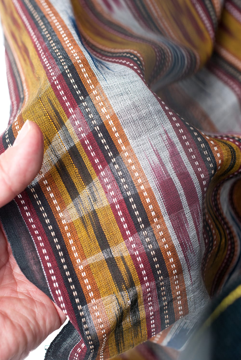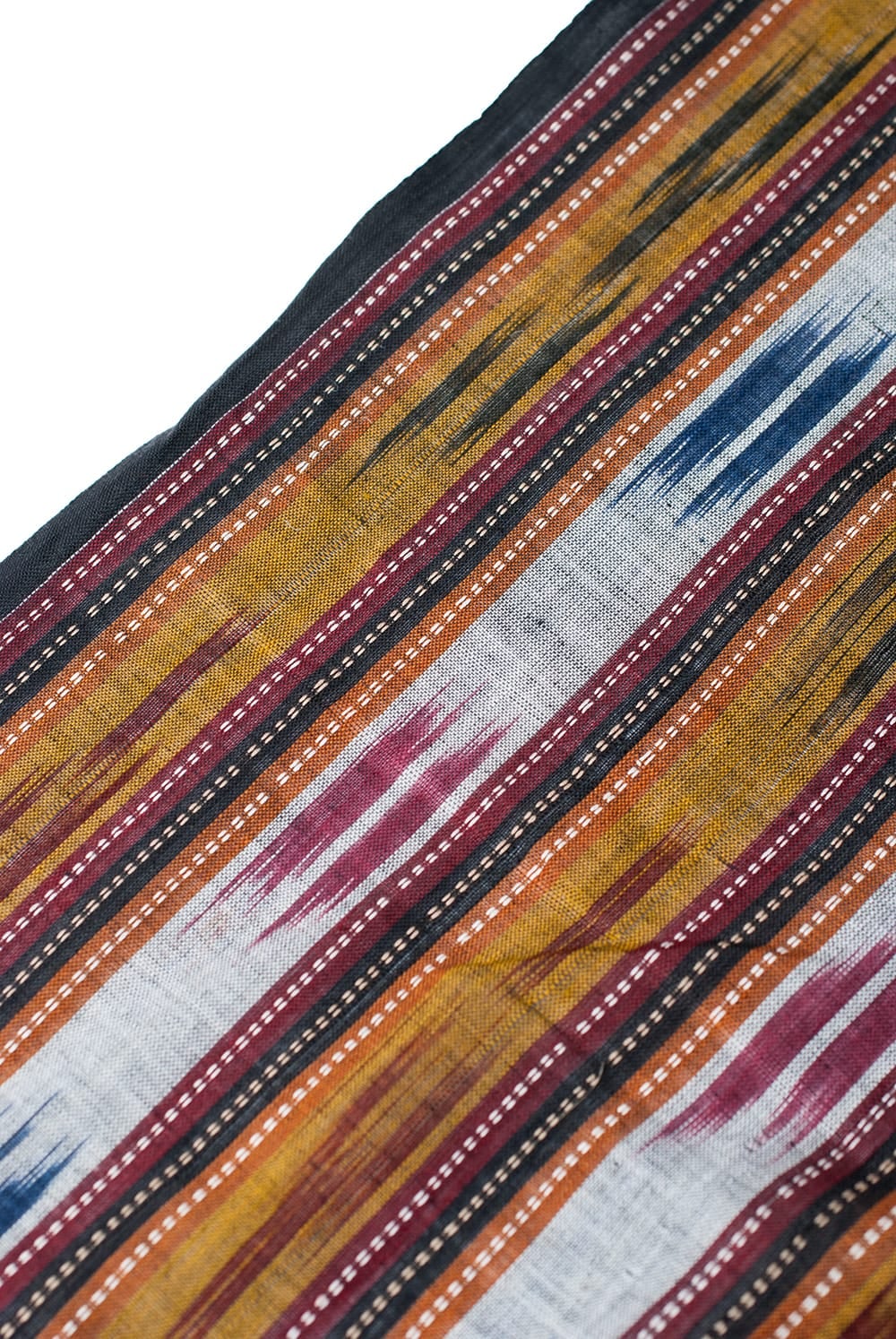 日本の絣織りの起源となったともされる「イカット」織りの切布です。縦糸と横糸にそれぞれ計算して色を染めておき、それらを織り合わせることで精緻な図形が生じるようになっています。■上品で使いやすい!